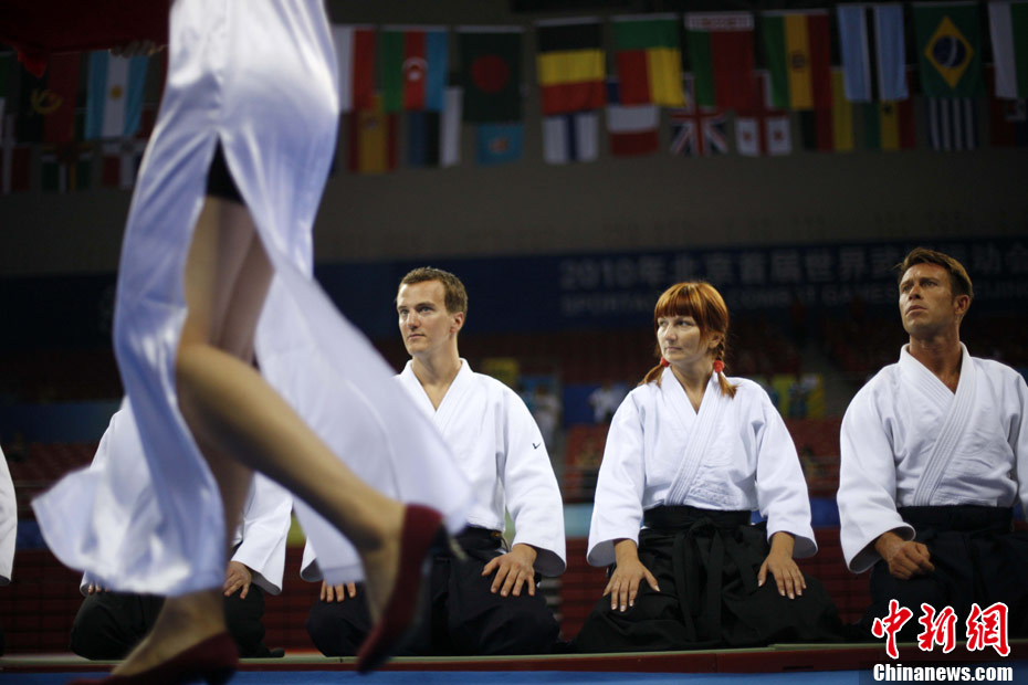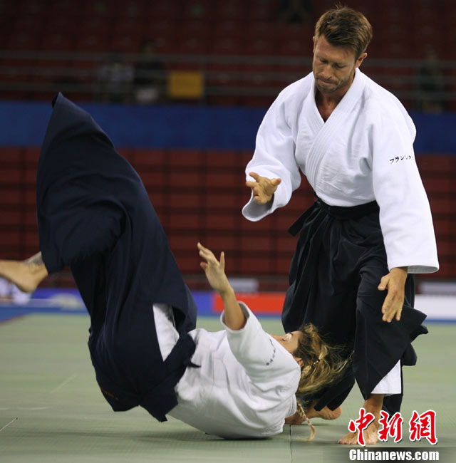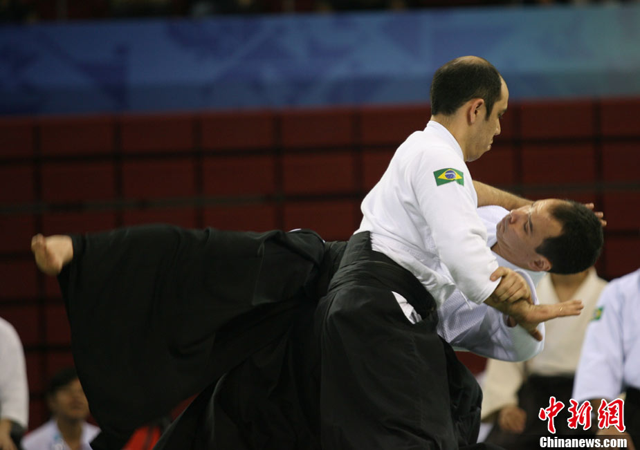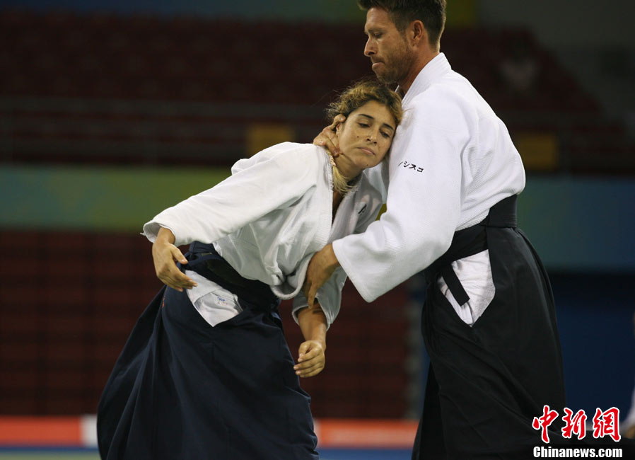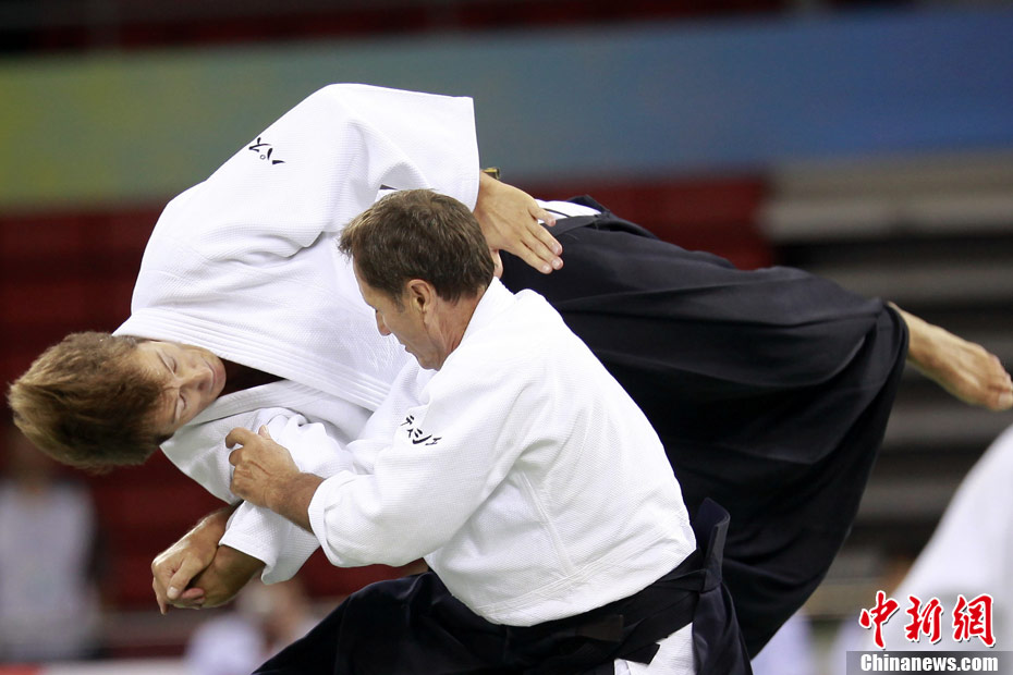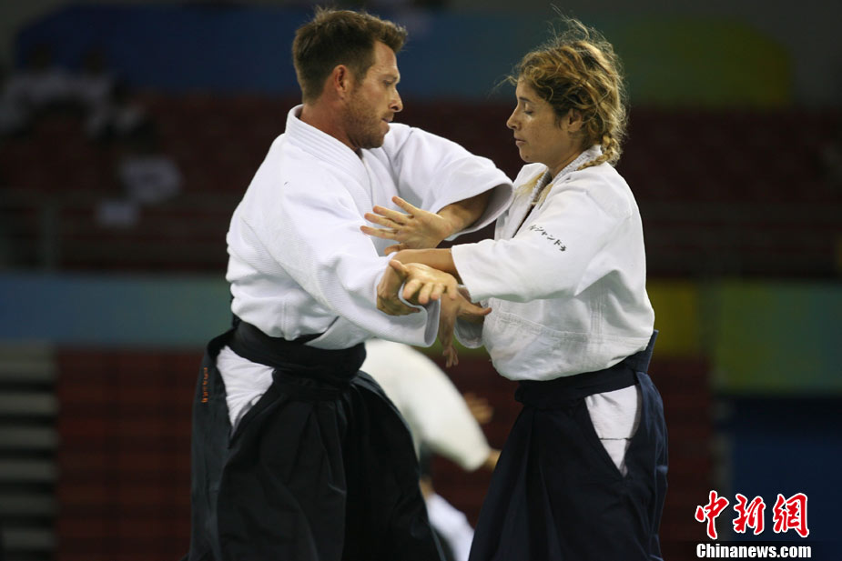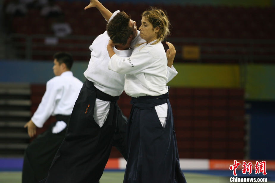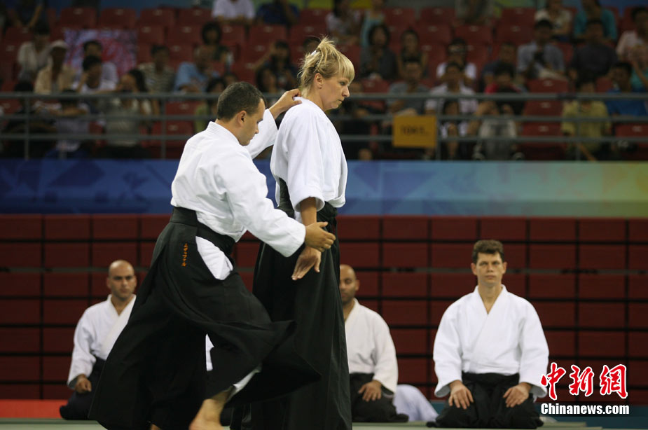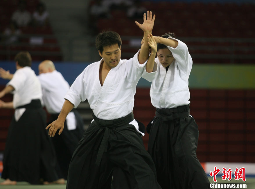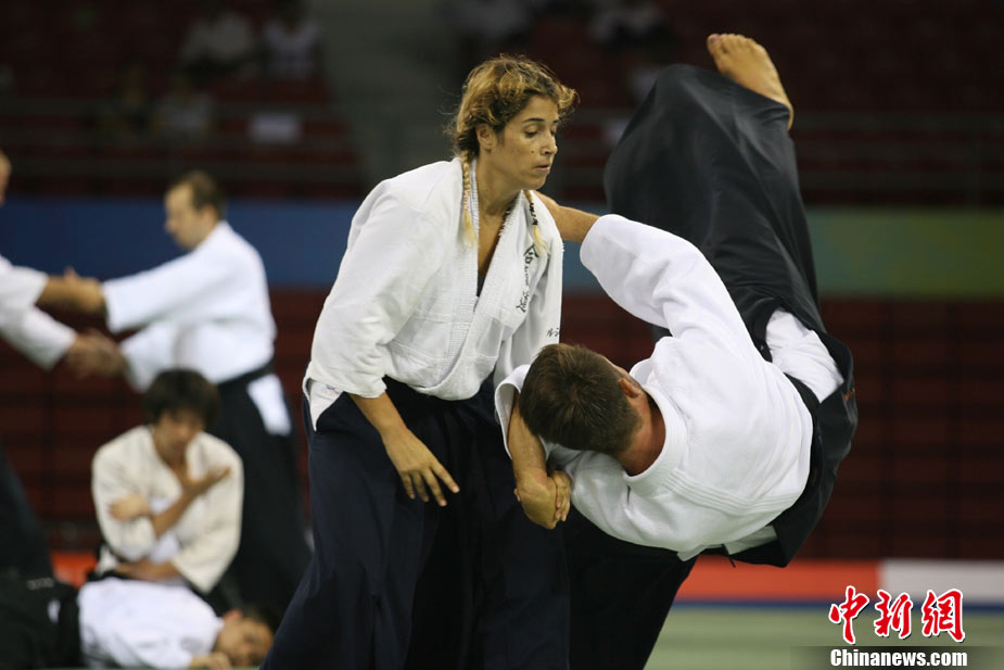 8月30日,男女選手在北京武搏會合氣道比賽上演了“異性對決”。合氣道是一種根源于日本大東流合氣柔術(shù)的近代武術(shù),合氣道不注重比賽的勝負,沒有跟別人較量的思想,而是跟他人一起鍛煉和修養(yǎng)自己,因此才會有鮮見的異性同場對決的場面出現(xiàn)。本次武搏會,合氣道將作為表演項目,無特別的規(guī)則,因此不能夠嚴格地定義勝利者或者失敗者。國際合氣道聯(lián)合會將組織高段教官來評判各項表演,表演賽分為基本技巧、高級技巧和復(fù)合技巧等三個單元。 中新社發(fā) 蘇丹 攝