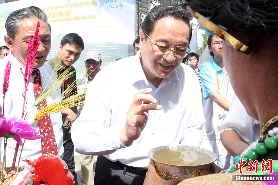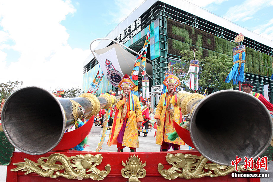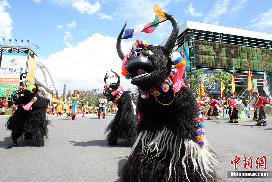9月1日,為期5天的上海世博會(huì)西藏周在世博園拉開帷幕;顒(dòng)周期間,將先后有《天上西藏》寶綱舞臺(tái)演出、非物質(zhì)文化遺產(chǎn)展示、街頭花車巡游表演、慶典廣場《雪域歡歌》、特色產(chǎn)品展示等活動(dòng)與參觀者見面,全方位展示西藏人文魅力。圖為西藏活動(dòng)周開幕現(xiàn)場吹響開幕號。中新社記者 湯彥俊 攝