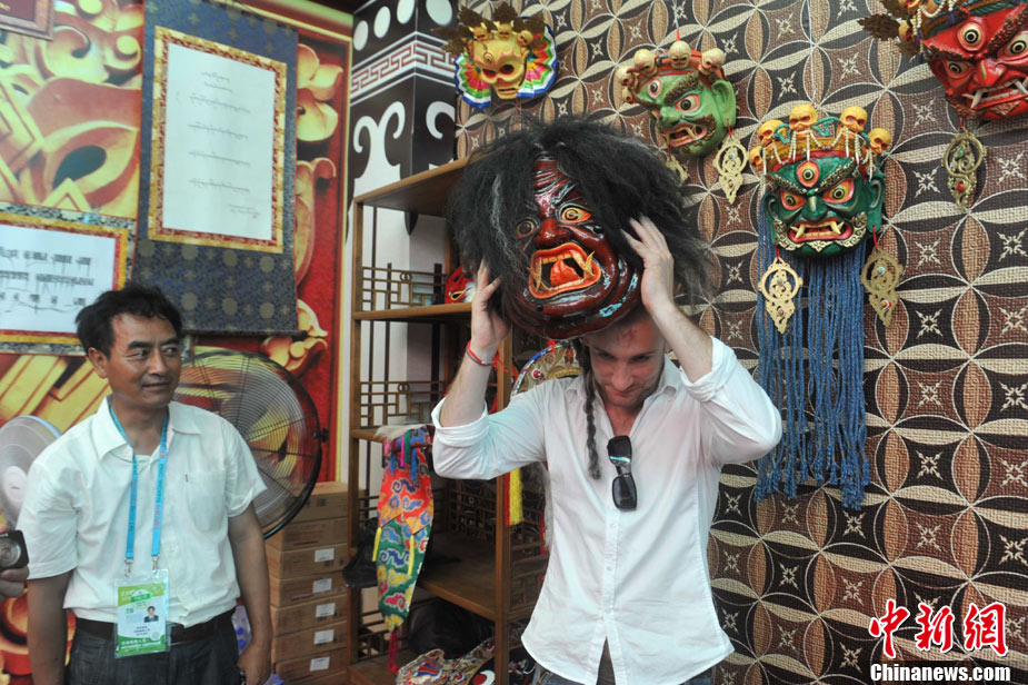 9月3日,上海世博會(huì)西藏活動(dòng)周進(jìn)入第3天。土耳其姑娘Esmeralda Sinani來到上海世博會(huì)寶鋼大舞臺,體驗(yàn)藏族文化。圖為Esmeralda Sinani在喝酥油茶,并向藏族人吉吉了解酥油茶相關(guān)的文化。 中新社記者 蔣雪林 攝