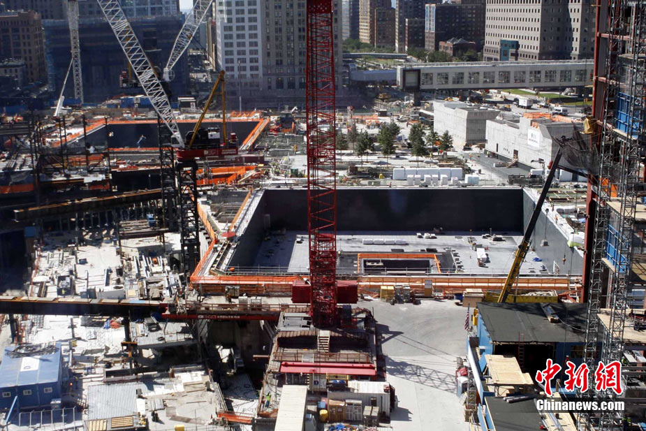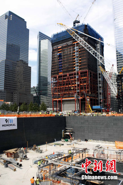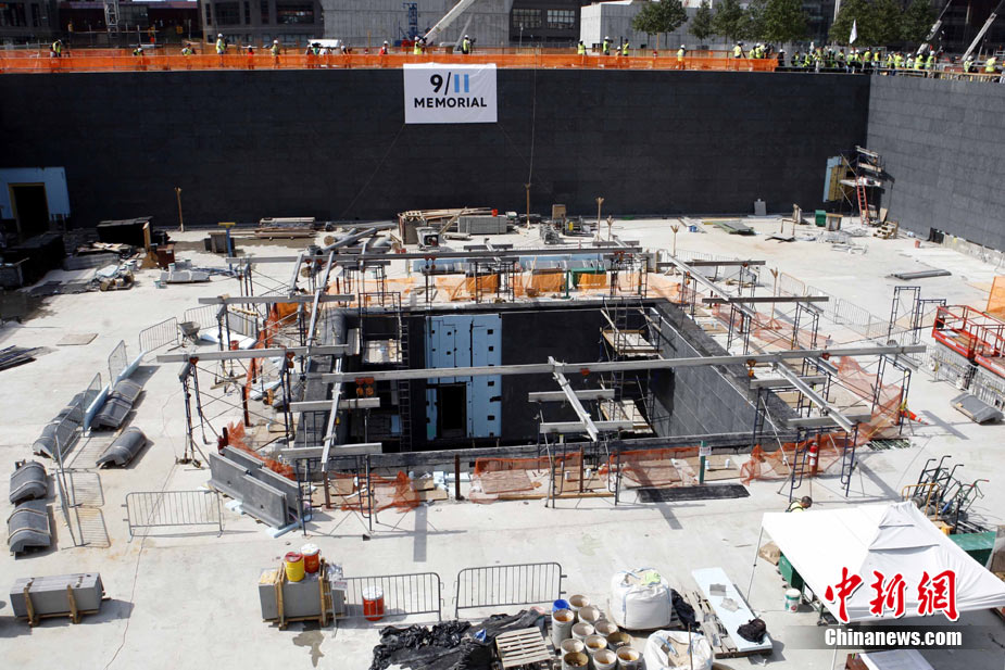 美國當(dāng)?shù)貢r(shí)間9月7日,記者在紐約世貿(mào)建筑工地現(xiàn)場看到,以原先世貿(mào)雙子塔樓基座為主體的兩個(gè)方形瀑布池業(yè)已成型,周圍也種上了些許綠樹。9·11紀(jì)念館館長喬·丹尼爾斯表示,肯定將在事件十周年紀(jì)念日當(dāng)天開館。中新社記者 孫宇挺 攝