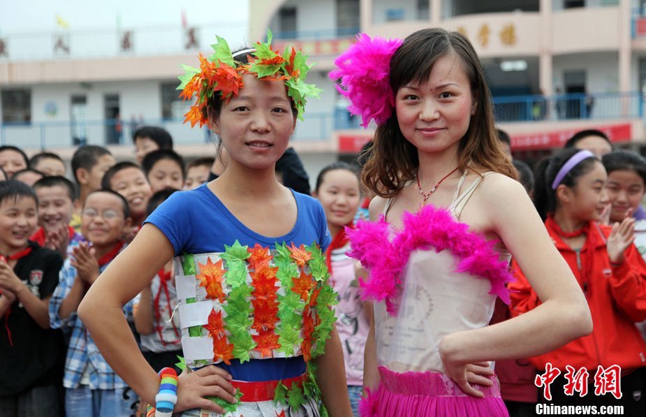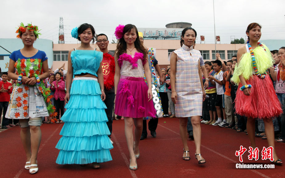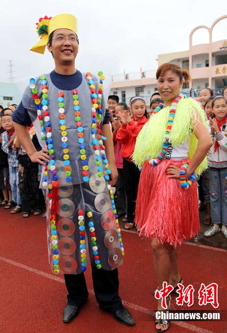 9月8日,山東省棗莊市市中區(qū)中興小學(xué)教師用舊報(bào)紙、光盤等廢舊物品制作的環(huán)保“時(shí)裝”,向?qū)W生們進(jìn)行展示。他們用實(shí)際行動(dòng)引導(dǎo)學(xué)生養(yǎng)成低碳生活的良好習(xí)慣,喜迎教師節(jié)到來。中新社發(fā) 吉 喆 攝 圖片來源:CNSPHOTO