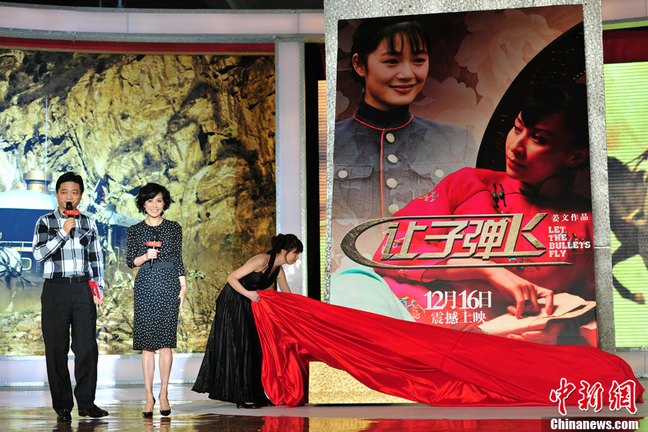9月16日,將于12月26日震撼上映的電影《讓子彈飛》導(dǎo)演姜文攜主演劉嘉玲、廖凡、邵兵亮相北京,為即將上映的新作站臺宣傳。當(dāng)回答“票房預(yù)期”時(shí),姜文自信的表示“我們這個(gè)戲里有葛優(yōu),有周潤發(fā),以前別人說一個(gè)電影‘不優(yōu)不發(fā)’或者說‘不發(fā)不優(yōu)’。那我們這個(gè)片子里又有(葛)優(yōu)又有(周潤)發(fā),我都不敢想能賣多少了。” 女主角劉嘉玲在片中“情挑”姜文、周潤發(fā)、葛優(yōu)三影帝。她更是對《讓子彈飛》成為今年內(nèi)地票房冠軍充滿信心,表示假如梁朝偉《一代宗師》趕上賀歲檔,樂意打敗他們。