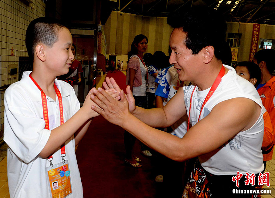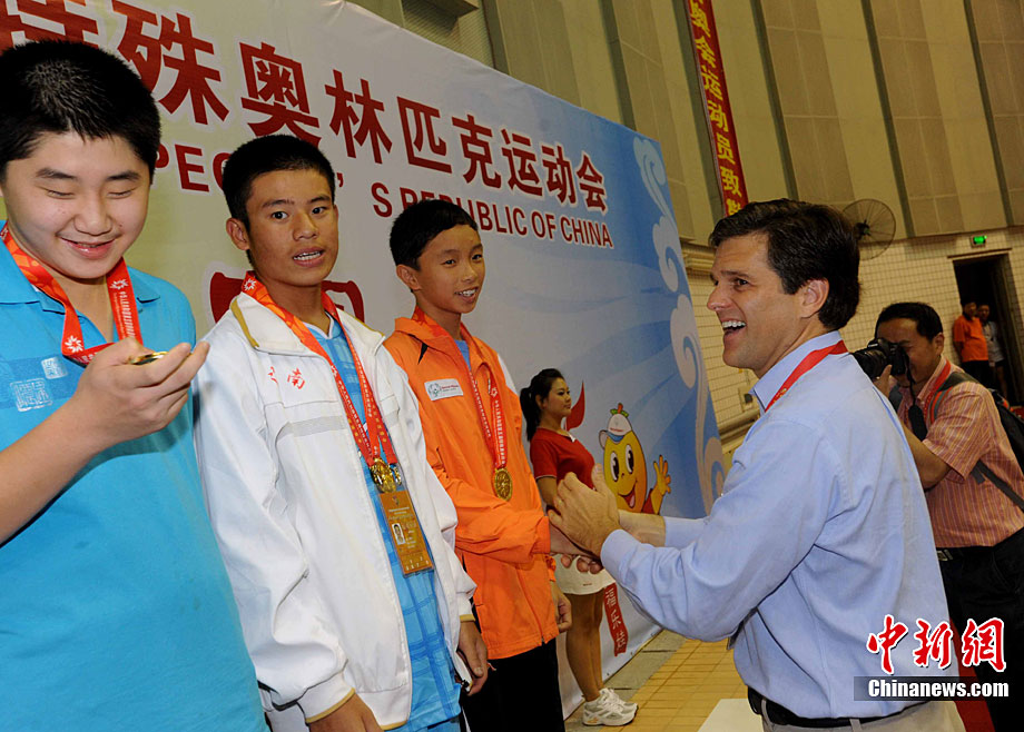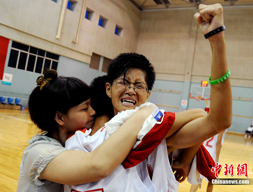 9月24日,在本屆特奧運動會男子籃球C組決賽中,福建一團力克對手獲得冠軍。圖為比賽結(jié)束后福建一團特奧籃球運動員張華閩、張華粵雙胞胎兄弟與一旁觀賽的母親唐秀玲相擁而泣,場面感人。劉可耕 攝