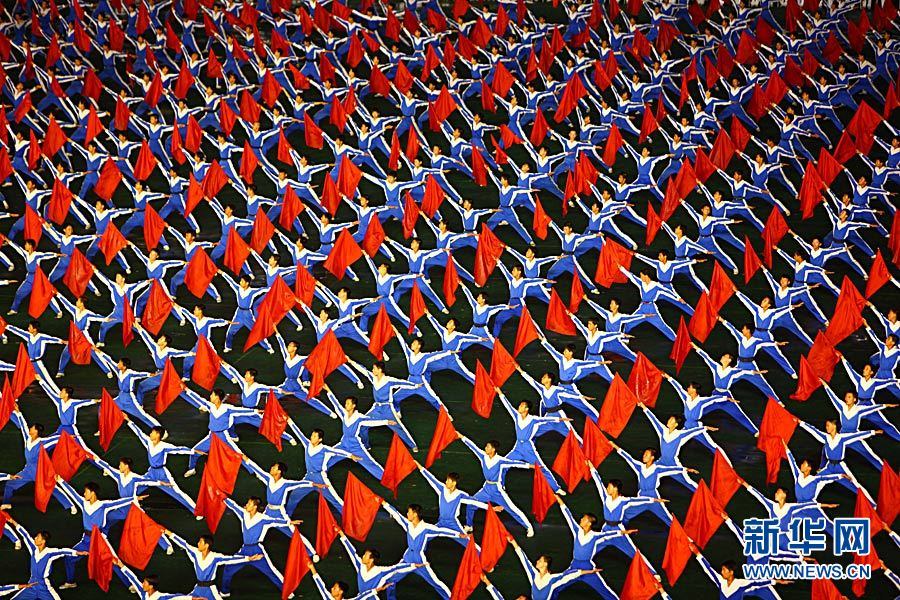8月14日,朝鮮青少年在平壤“五一體育場(chǎng)”表演大型團(tuán)體操和文藝表演《阿里郎》!栋⒗锢伞酚沙r10萬(wàn)名青少年和專業(yè)藝術(shù)工作者參與演出,規(guī)模之大堪稱世界之最。2007年8月,《阿里郎》被載入《吉尼斯世界紀(jì)錄》。朝鮮勞動(dòng)黨代表會(huì)議將于9月28日在平壤舉行。劉宇攝 圖片來(lái)源:新華網(wǎng)