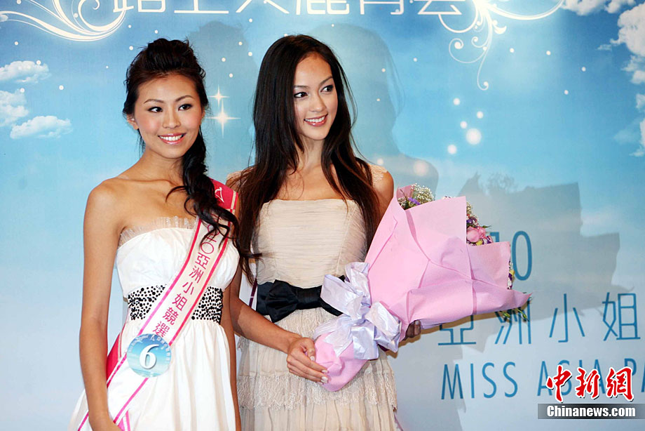 10月5日,參加《2010亞洲小姐競選--港澳賽區(qū)》的佳麗在香港一家酒店登臺亮相,與大會形象顧問團成員會面。圖為6號佳麗李瑩瑩向形態(tài)顧問Jessica C獻花。中新社發(fā) 洪少葵 攝