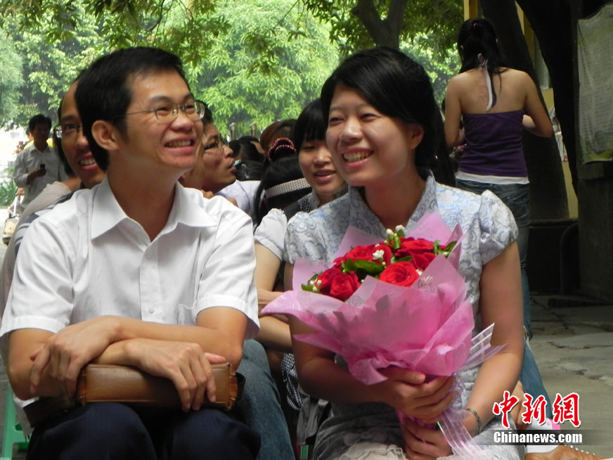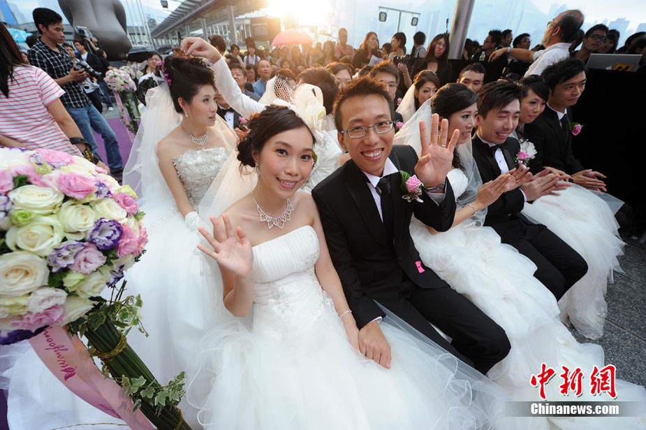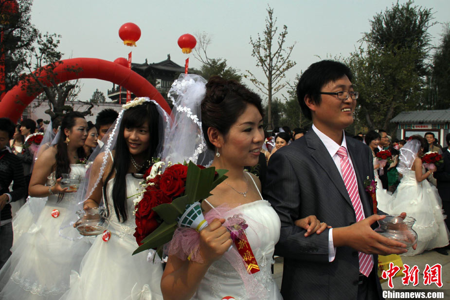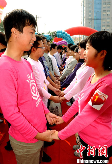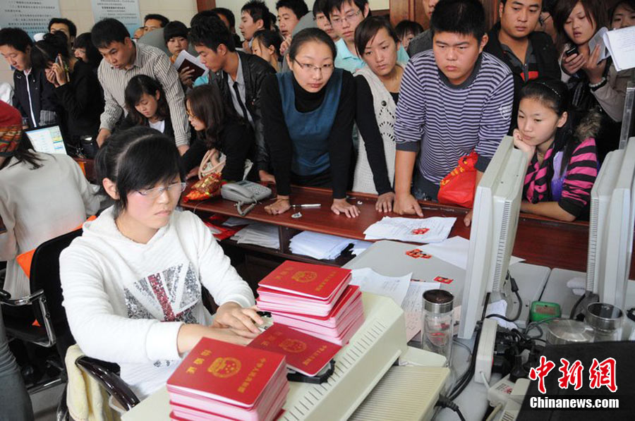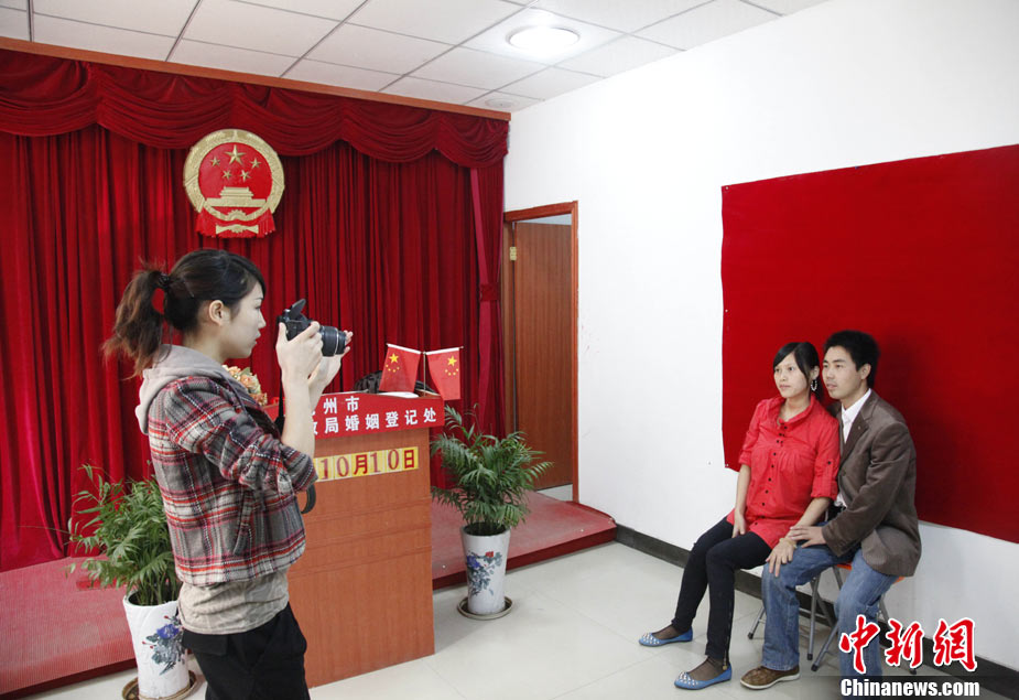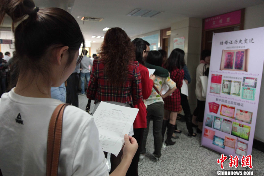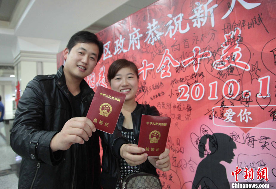 2010年10月10日,全國(guó)各地新人辦理結(jié)婚登記。很多新人選擇被寓意“十全十美”的好日子領(lǐng)結(jié)婚證。圖為鄭州出現(xiàn)結(jié)婚登記高峰,導(dǎo)致各區(qū)民政局婚姻登記處門(mén)前都排起長(zhǎng)長(zhǎng)的隊(duì)伍。一對(duì)新人在長(zhǎng)長(zhǎng)的隊(duì)伍中手挽手排除等候。沙浪 攝 圖片來(lái)源:CFP視覺(jué)中國(guó)