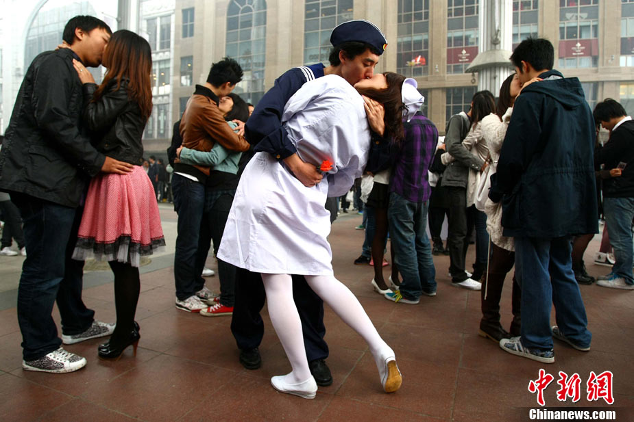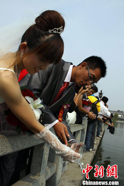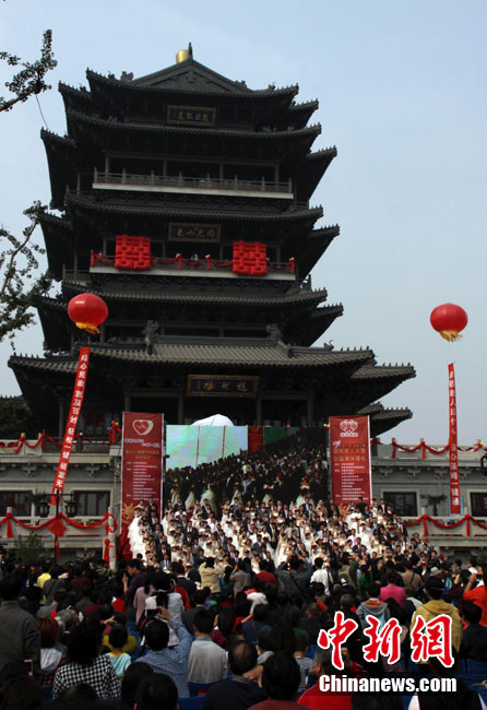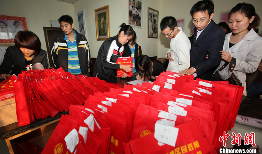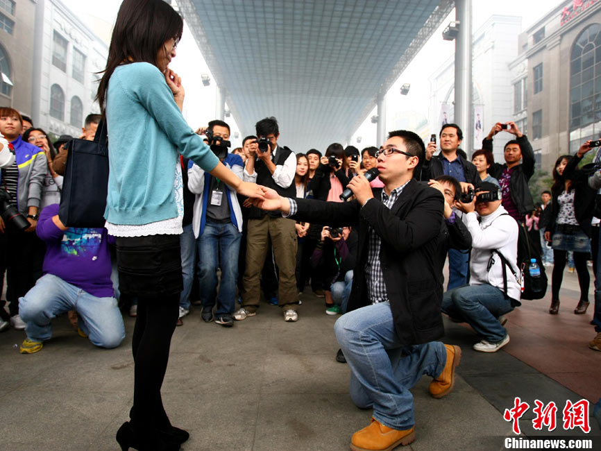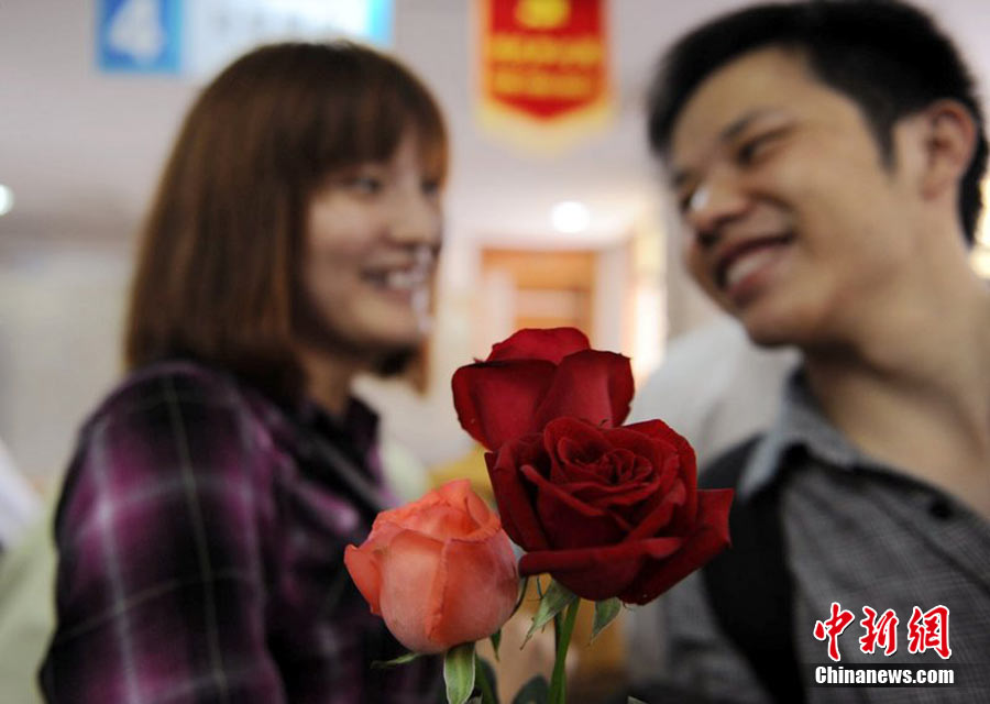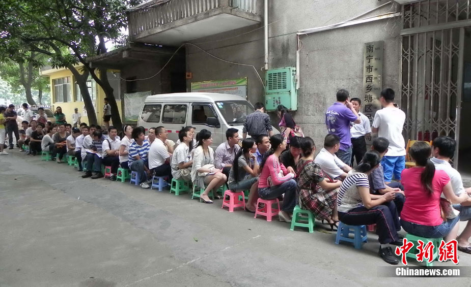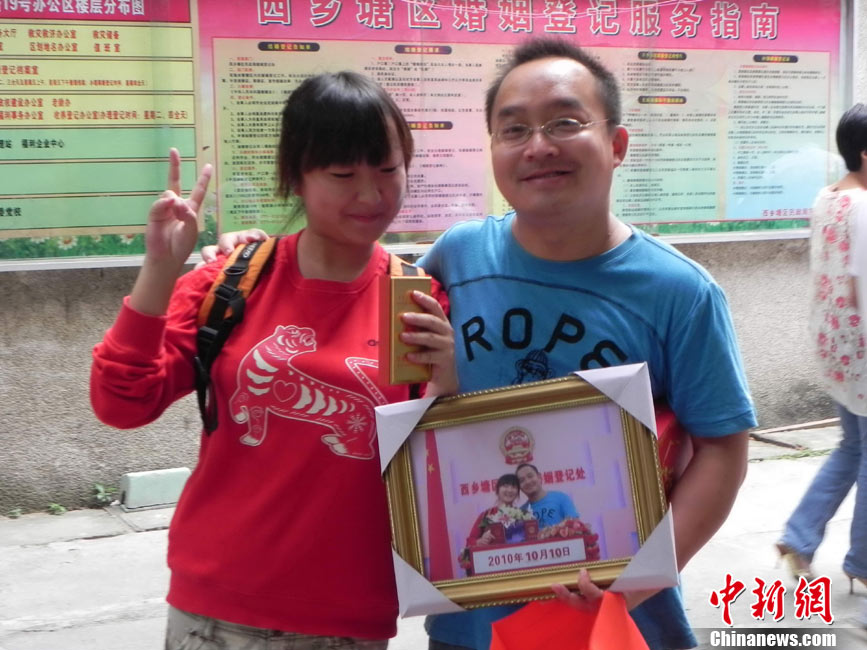2010年10月10日,全國(guó)各地新人辦理結(jié)婚登記。很多新人選擇被寓意“十全十美”的好日子領(lǐng)結(jié)婚證。圖為鄭州出現(xiàn)結(jié)婚登記高峰,導(dǎo)致各區(qū)民政局婚姻登記處門(mén)前都排起長(zhǎng)長(zhǎng)的隊(duì)伍。一對(duì)新人在長(zhǎng)長(zhǎng)的隊(duì)伍中手挽手排除等候。沙浪 攝 圖片來(lái)源:CFP視覺(jué)中國(guó)