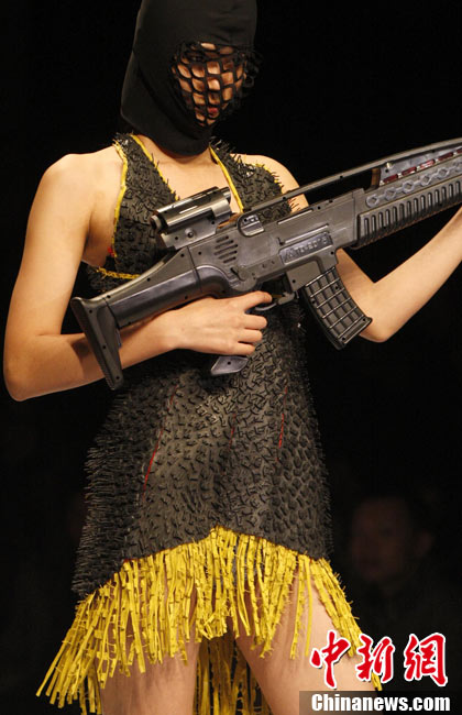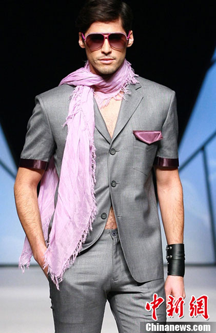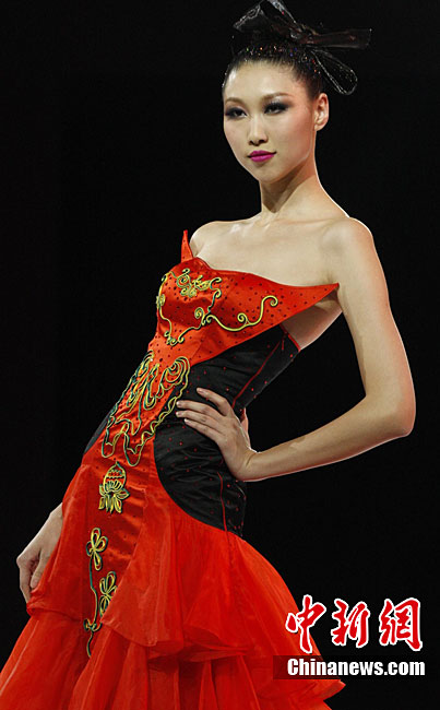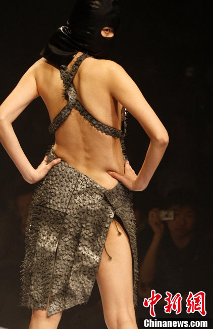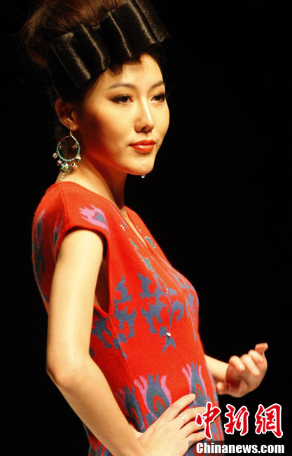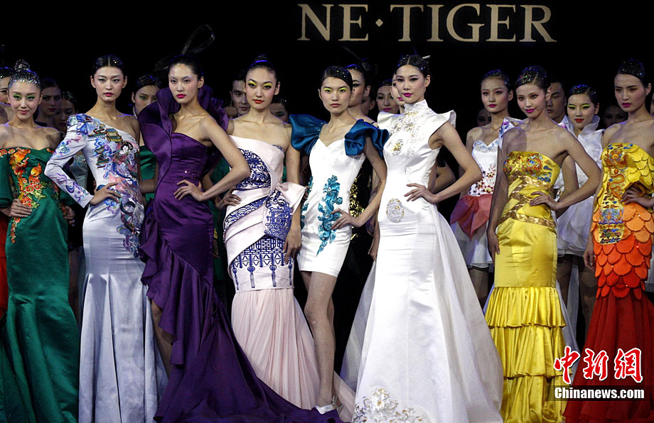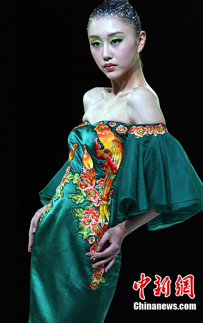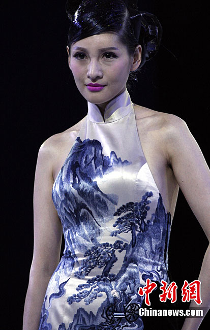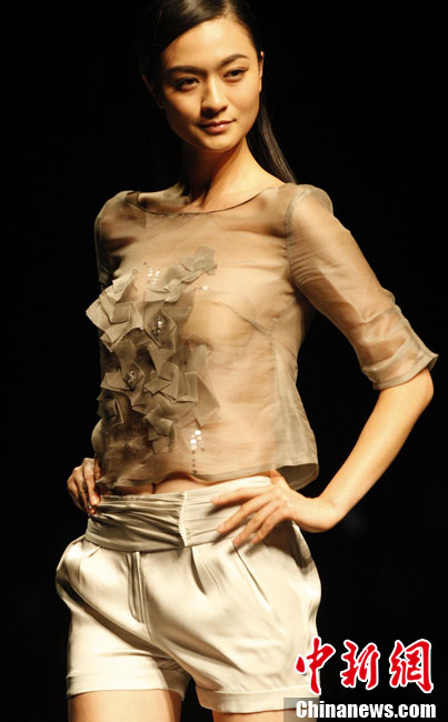 10月26日晚,正在北京舉行的中國國際時裝周上演EACHWAY·趙卉洲2011春夏時裝發(fā)布會,該作品風格簡約自然、清新優(yōu)雅、大氣內(nèi)斂,贏得眾多職場女性的青睞。2011春夏系列包含三大主題:“深海精靈”(藍綠色系)、“夢游幻境”(粉紫色系)、“雙色游戲”(米咖色系),圍繞摩登柔美和經(jīng)典的花卉印花兩大元素展開。中新社記者 錢興強 攝