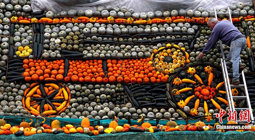 萬(wàn)圣節(jié)到來(lái)的前夕,英國(guó)斯林登老農(nóng)托尼·史密斯將自己種植數(shù)百只南瓜堆成牽引機(jī)車的模型。