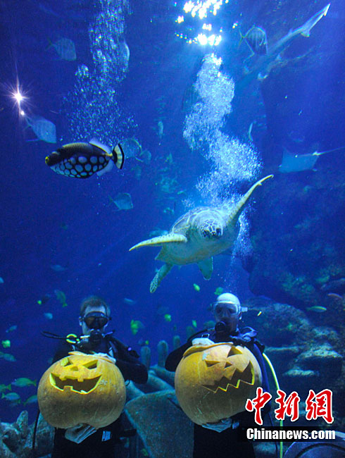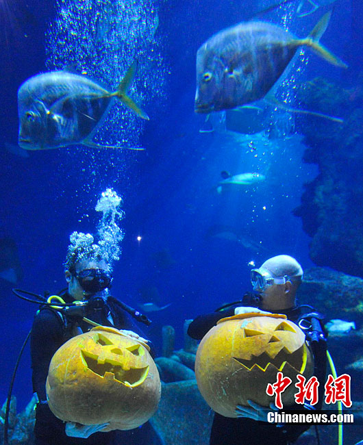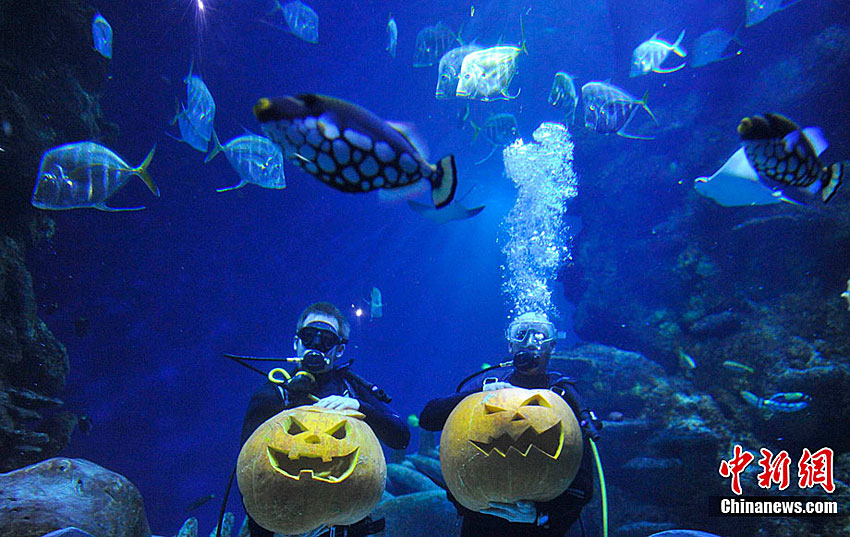 潛水員水下雕南瓜宣傳倫敦水族館萬(wàn)圣節(jié)活動(dòng)