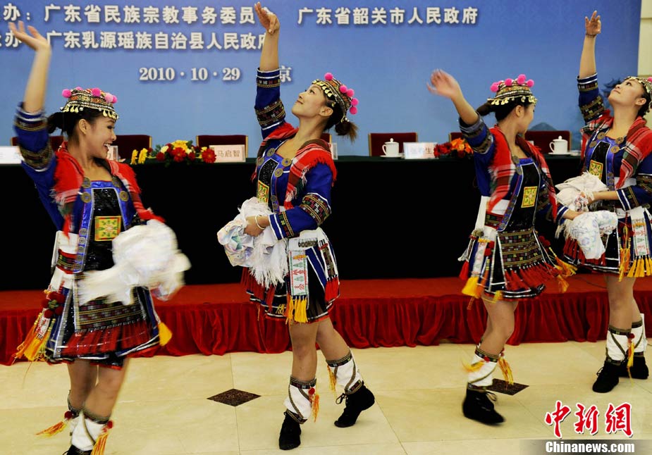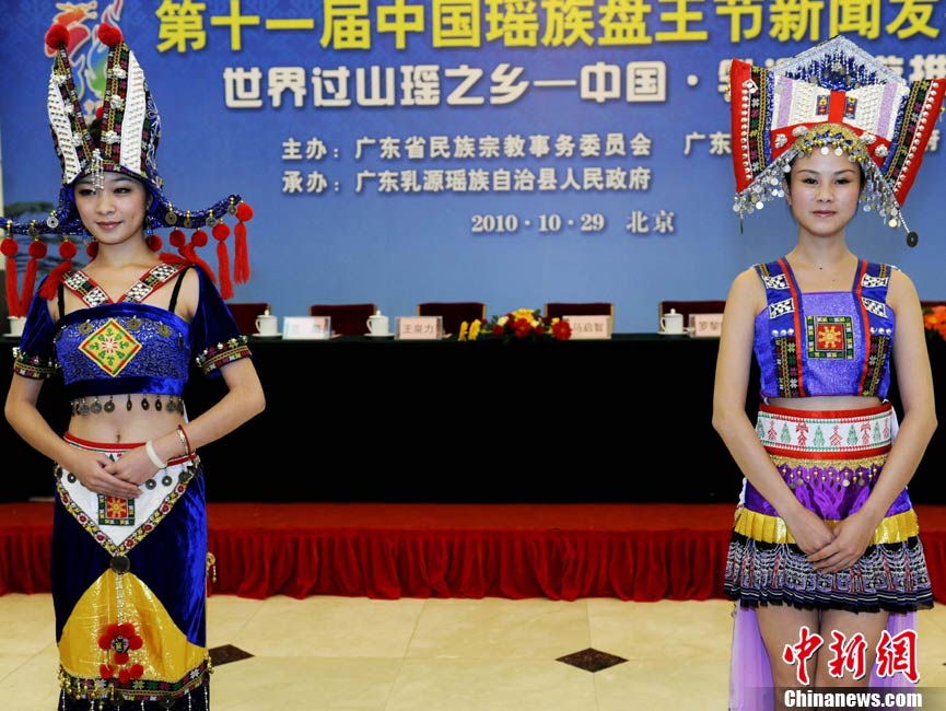 10月29日,第十一屆中國瑤族盤王節(jié)新聞發(fā)布會暨世界過山瑤之鄉(xiāng)——中國乳源旅游推介會在人民大會堂召開。本次會議發(fā)布,世界瑤族人民的盛會——第十一屆中國瑤族盤王節(jié)將于2010年11月20日至22日在廣東乳源瑤族自治縣隆重舉行。瑤族盤王節(jié)是瑤族人民紀念其始祖盤王(盤瓠)的盛大節(jié)日。圖為“瑤族公主”形象代表身著湘粵桂南嶺地區(qū)的瑤族盛裝亮相新聞發(fā)布會。中新社記者 劉震 攝