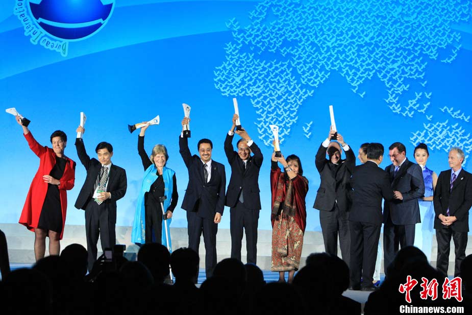 10月30日晚,上海世博會舉行頒獎晚會,頒發(fā)“世博會獎”、“COSMOS”獎、“國展局獎?wù)隆薄!笆啦⿻劇狈譃锳BCD四類展館和金銀銅等次以及展館設(shè)計(jì)獎、創(chuàng)意展示獎、主題演繹獎。圖為英國、韓國、西班牙分別獲得A類展館設(shè)計(jì)獎金銀銅;沙特、日本、馬來西亞分別獲得創(chuàng)意展示獎金銀銅;德國、俄羅斯、法國分別獲得主題演繹獎金銀銅。 中新社記者 潘索菲 攝