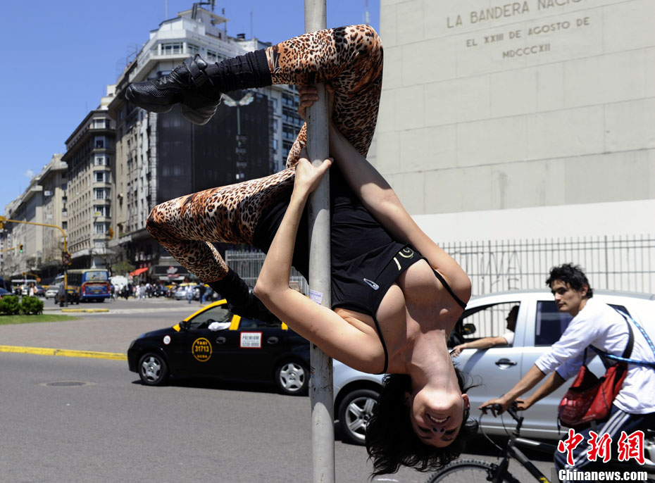 當(dāng)?shù)貢r(shí)間11月5日,阿根廷“鋼管舞小姐大賽”評(píng)委在布宜諾斯艾利斯街頭上演了火辣的鋼管舞表演。