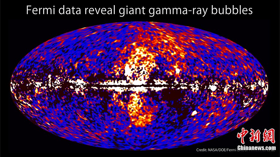 科學(xué)家日前最新探測發(fā)現(xiàn)銀河系中心溢出高能量放射線形成的兩個巨大氣泡,并認為這兩個巨大的氣泡源自一個超大質(zhì)量黑洞的噴發(fā)。每個神秘的宇宙氣泡結(jié)構(gòu)直徑跨越25000光年,兩個氣泡連接起來可覆蓋可見夜空一半的區(qū)域,它們噴射著伽馬射線(高能量波長光線)。