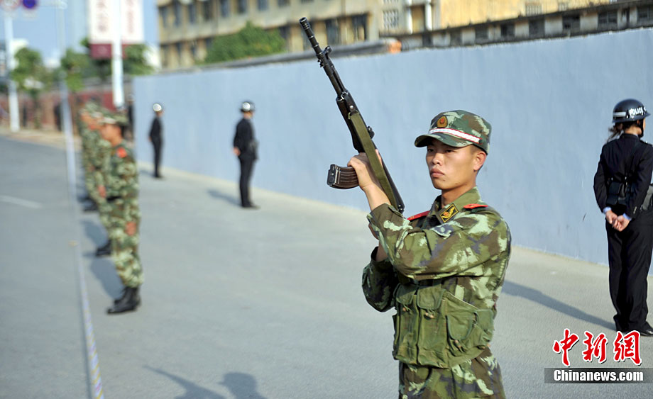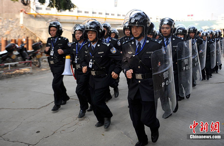 11月11日下午,為提高監(jiān)獄安全防范和及時(shí)有效處置突發(fā)事件的能力,廣西監(jiān)獄局組織駐南寧監(jiān)獄單位進(jìn)行了制暴追逃預(yù)案應(yīng)急處置實(shí)戰(zhàn)演練。本次制暴追逃演練是駐南寧市監(jiān)獄單位和武警、公安交警應(yīng)對(duì)突發(fā)事件的首次聯(lián)合大練兵。參與警力達(dá)260余人!笆掳l(fā)監(jiān)獄”在周邊監(jiān)獄單位、武警官兵、公安民警的權(quán)利配合下,成功處置4名“罪犯”企圖制造騷亂、趁機(jī)越獄脫逃“事件”。中新社記者 蔣雪林 攝