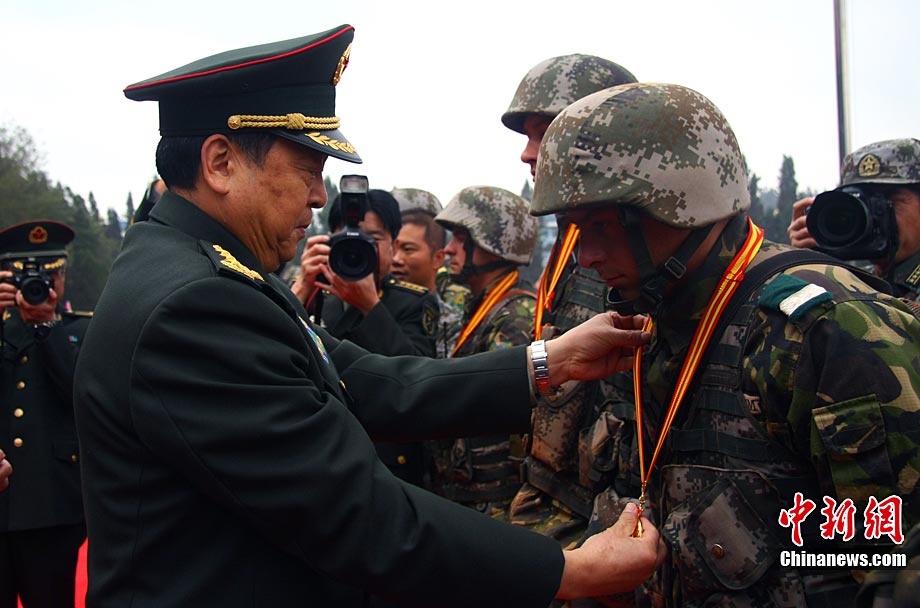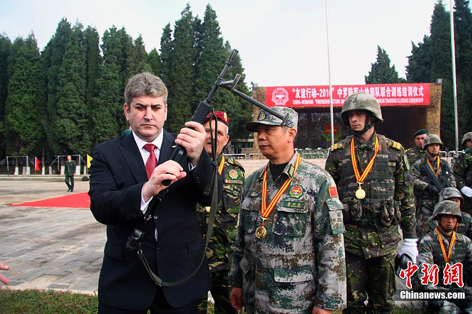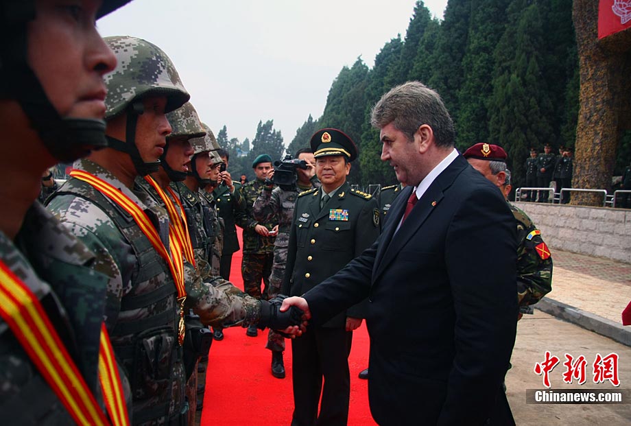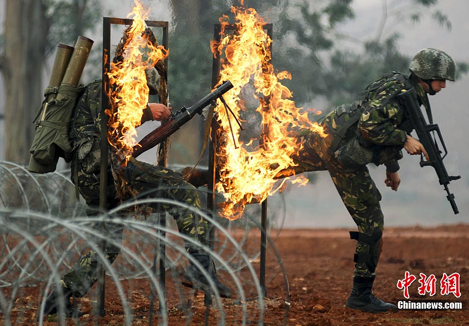 11月13日,“友誼行動-2010”中國與羅馬尼亞陸軍山地部隊在云南昆明進(jìn)行了9天的聯(lián)合訓(xùn)練后結(jié)束。中羅雙方士兵在結(jié)訓(xùn)儀式上進(jìn)行了步槍、狙擊槍射擊的匯報表演和混合編隊克服山地障礙等戰(zhàn)術(shù)綜合演練。圖為中羅雙方士兵表演戰(zhàn)術(shù)綜合演練穿過火圈。中新社發(fā) 任東 攝
