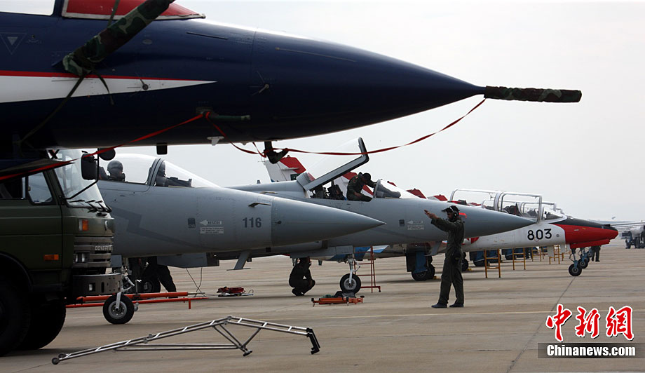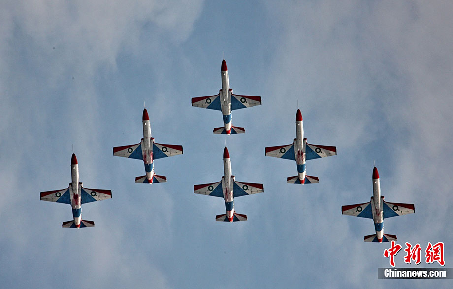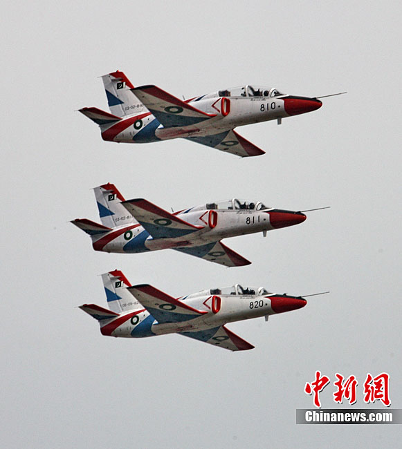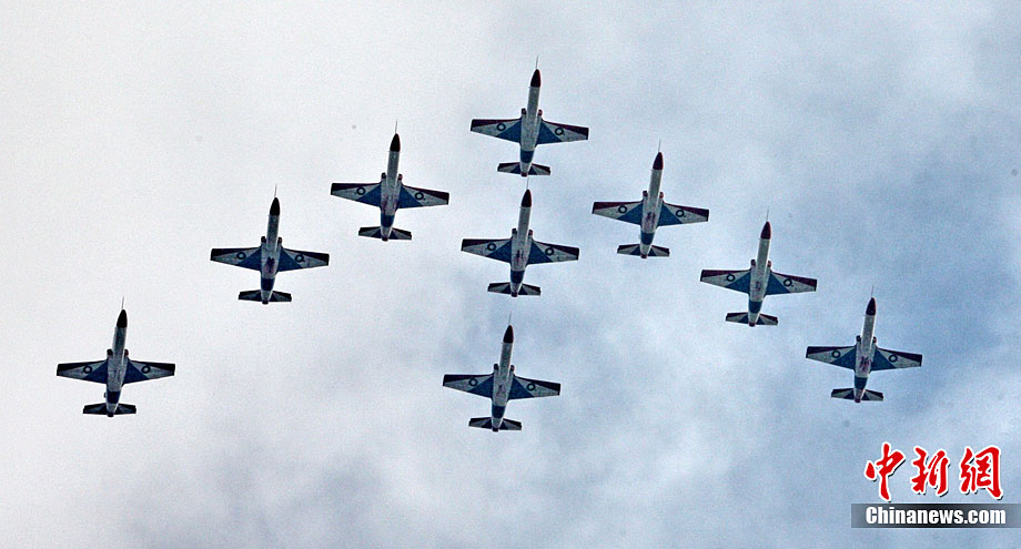 11月13日下午,巴基斯坦空軍“雄獅”飛行表演隊(duì)的飛行員駕駛k8教練機(jī)進(jìn)行九機(jī)密集隊(duì)形飛行訓(xùn)練。昨日,巴基斯坦空軍“雄獅”飛行表演隊(duì)抵達(dá)珠海,這支表演隊(duì)由10架K8教練機(jī)和一架C130運(yùn)輸保障機(jī)組成。由外國(guó)飛行員駕駛“中國(guó)造”飛機(jī)在中國(guó)航展上表演,必將是一道優(yōu)美而又特別的風(fēng)景。圖為巴基斯坦空軍“雄獅”飛行表演隊(duì)的飛行員駕駛k8教練機(jī)進(jìn)行九機(jī)密集隊(duì)形飛行訓(xùn)練。圖片來源:CNSPHOTO 喬天富 攝