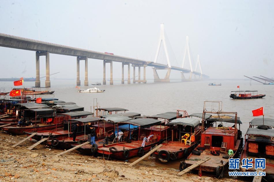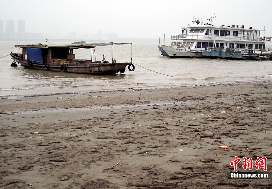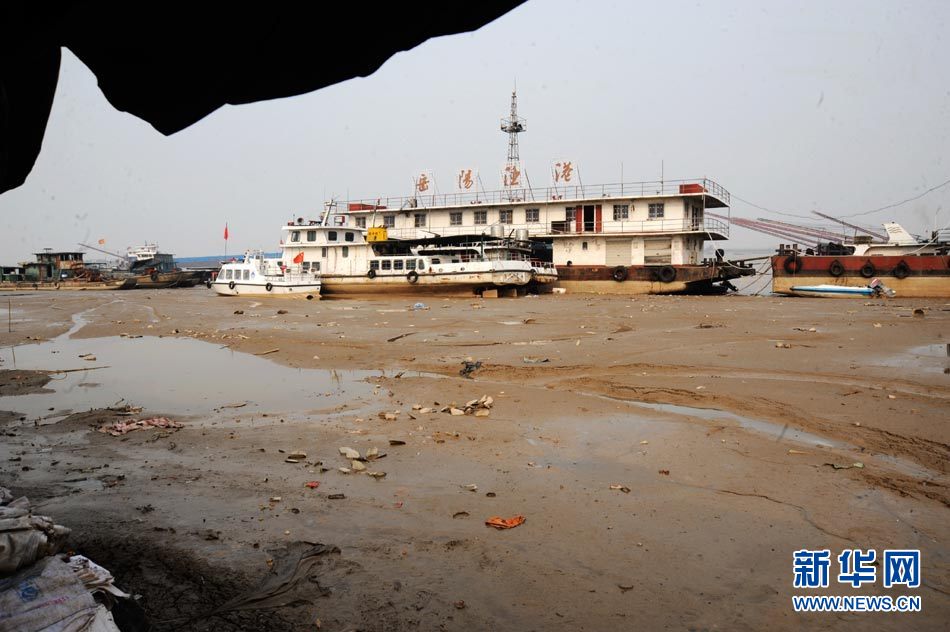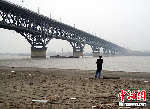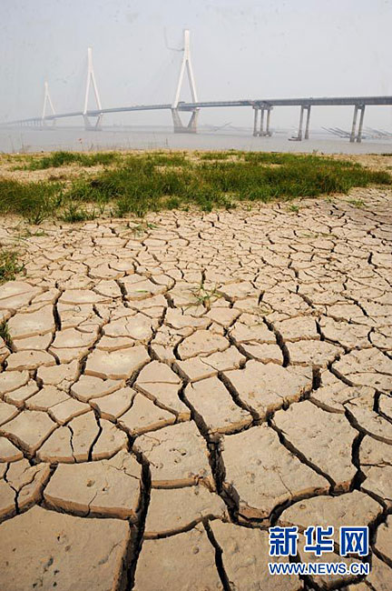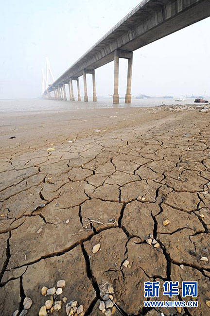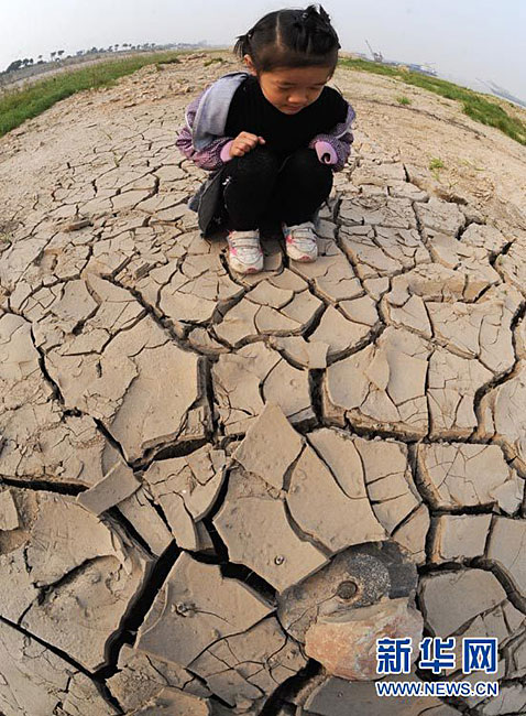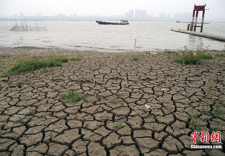 截至2010年11月14日17時(shí),長(zhǎng)江南京段水位降至4.08米,大片江岸河床裸露。近期,受中上游枯水和區(qū)域降雨量減少等因素影響,長(zhǎng)江南京段水位連續(xù)下降。圖為11月14日,長(zhǎng)江南京段南側(cè)江岸河床裸露,土層龜裂。圖片來源:CNSPHOTO 安東 攝