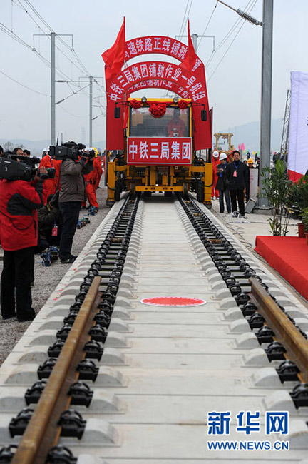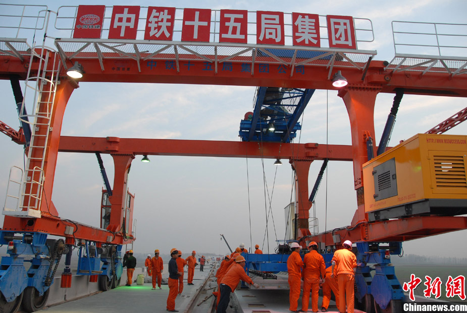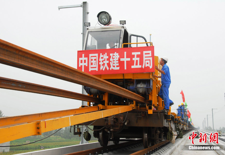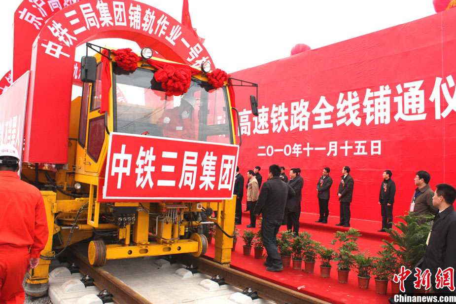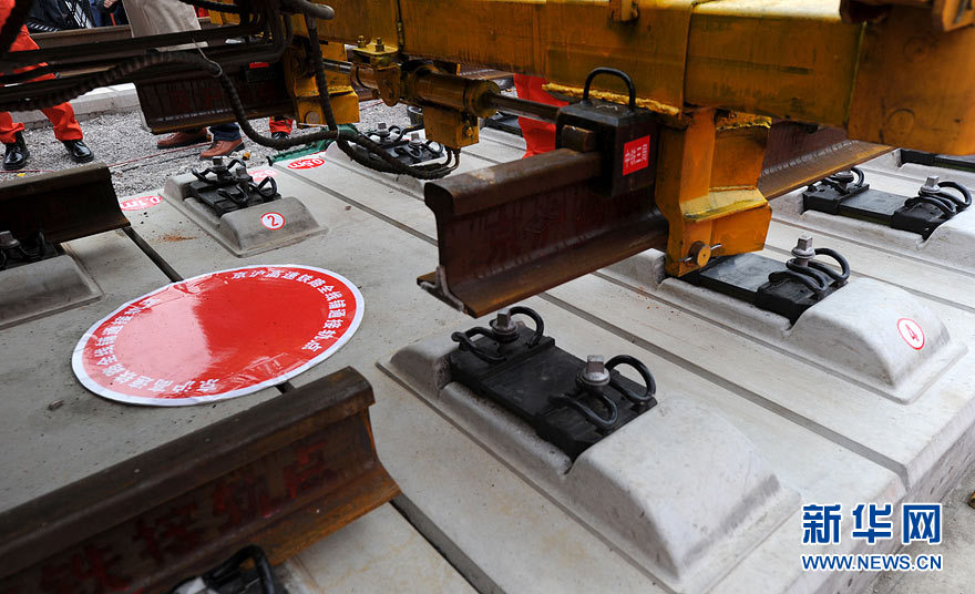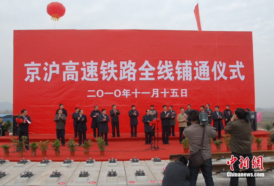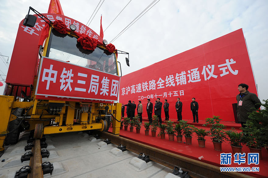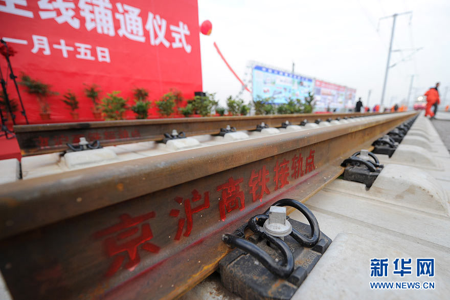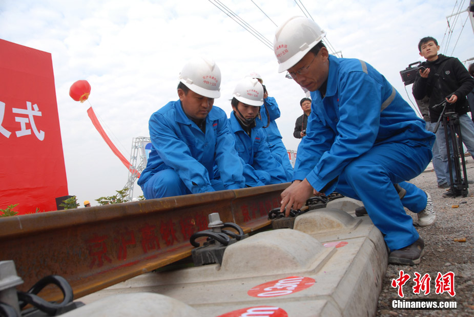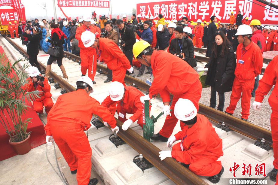 11月15日上午,隨著最后一根鐵軌在安徽蚌埠段順利鋪下,京滬高速鐵路全線完成鋪通工程,這是京滬高速鐵路建設(shè)取得的又一重大階段性成果。京滬高速鐵路的全線鋪通,標(biāo)志著以線下工程和鋪軌為主的站前工程全部結(jié)束,下一步將全力推進(jìn)以牽引供電、通信、信號(hào)、電力“四電集成”施工和站房建設(shè)為主的站后工程施工,展開(kāi)全線聯(lián)調(diào)聯(lián)試。圖為15日,京滬高鐵先導(dǎo)段鋪通儀式在京滬高鐵蚌埠南火車(chē)站舉行。中鐵十五局員工在接軌點(diǎn)安裝最后一組鋼軌鎖定螺栓。(張智海 范剛軍 李紅)