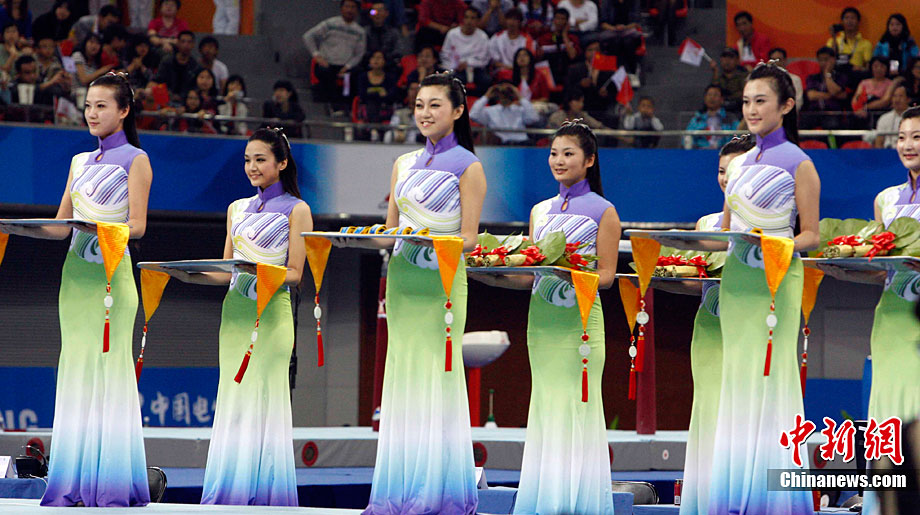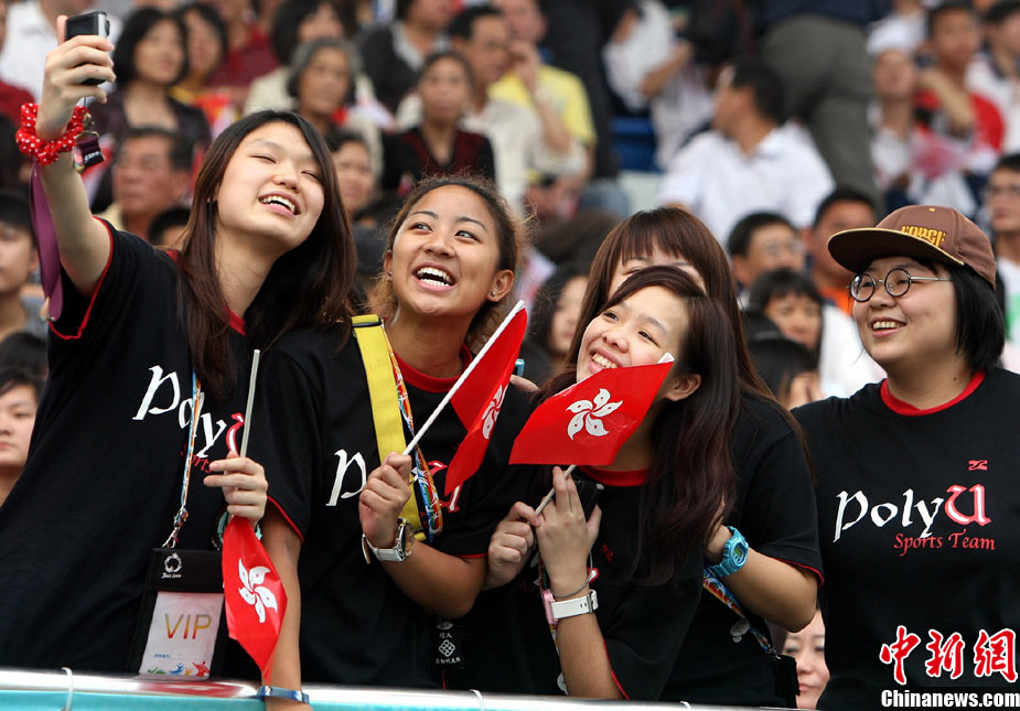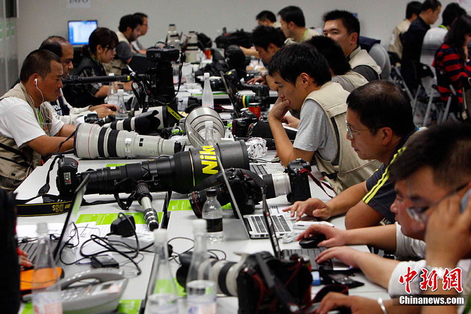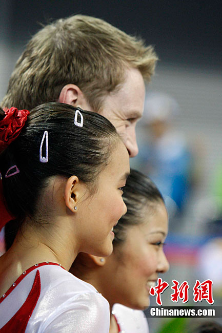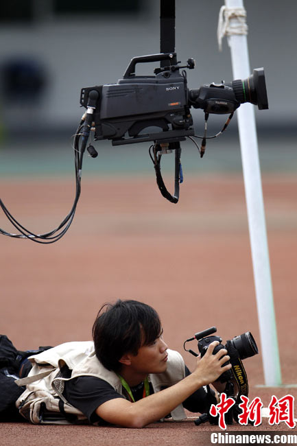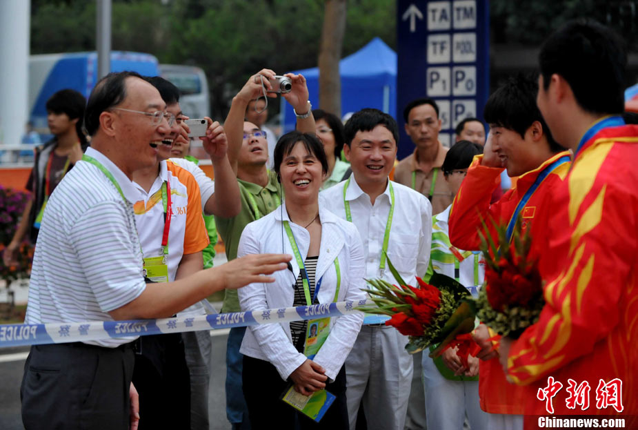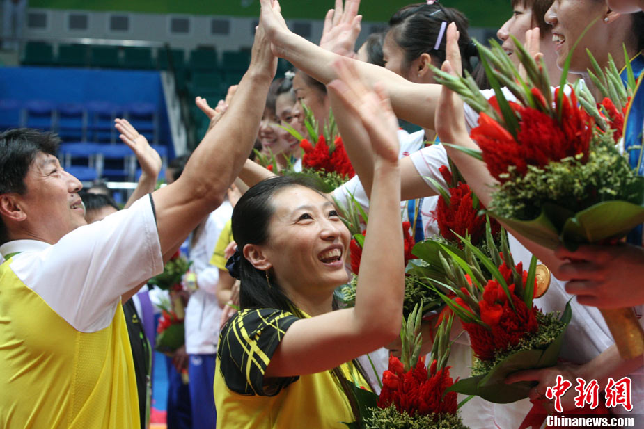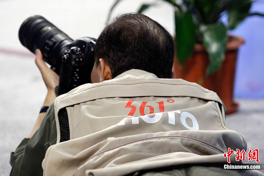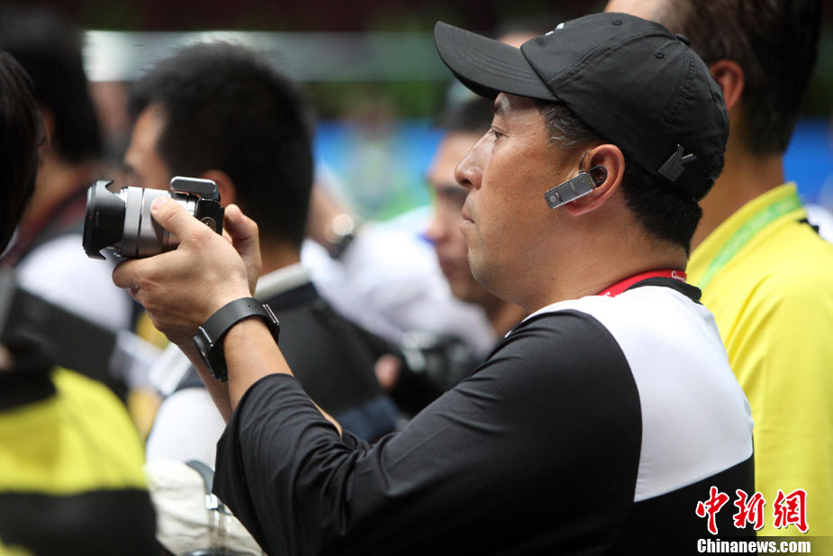 11月15日,中國女子羽毛球隊以3比0戰(zhàn)勝泰國隊奪得廣州亞運會女子團體冠軍。頒獎儀式上,李永波客串“攝影記者”記錄隊員歡慶一刻。 中新社記者 湯彥俊 攝