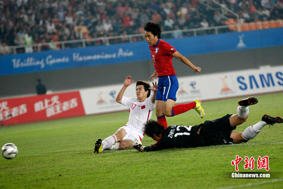11月15日晚,2010廣州亞運(yùn)會(huì)男子足球1/8決賽中國隊(duì)與韓國隊(duì)的比賽在廣州天河體育場(chǎng)進(jìn)行,最終中國隊(duì)0:3不敵對(duì)手,止步16強(qiáng)。 中新社記者 盛佳鵬 攝