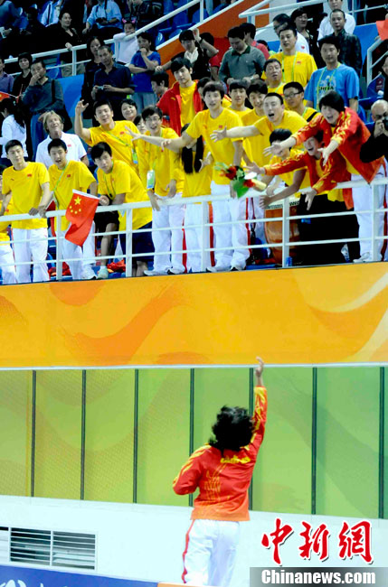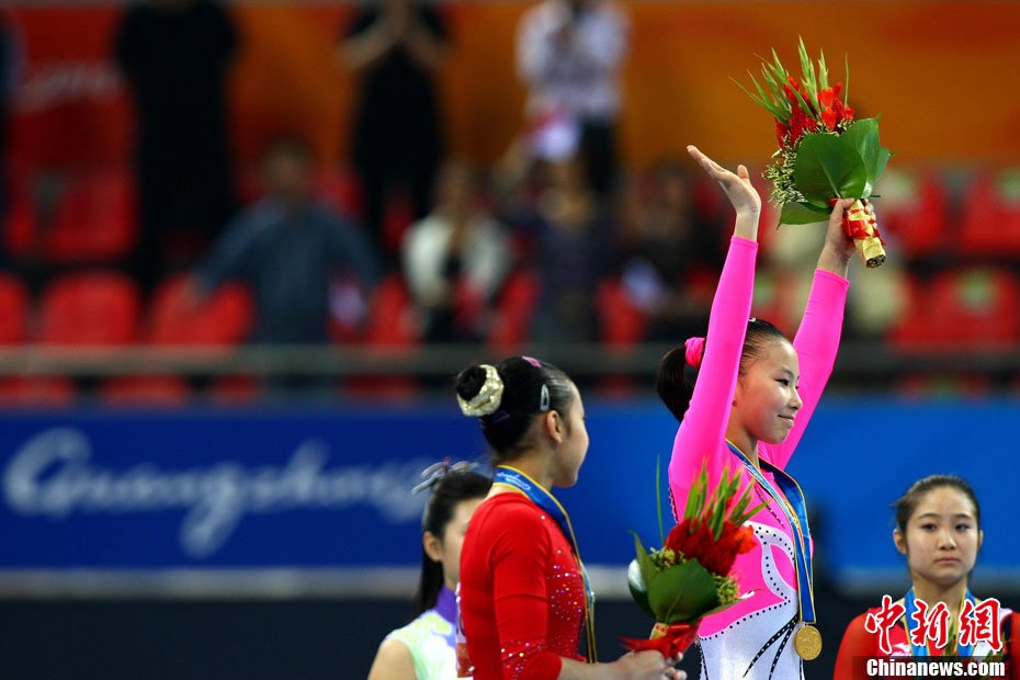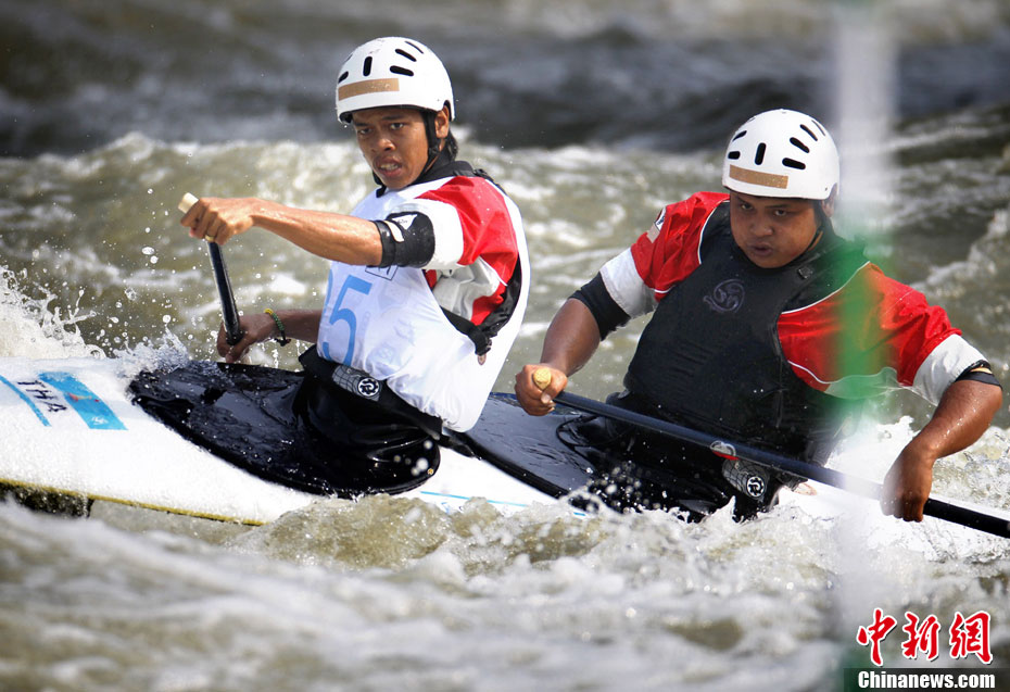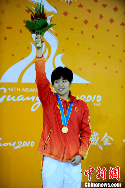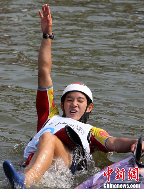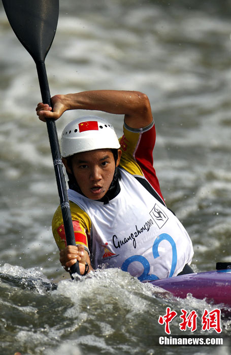 11月16日上午,中國(guó)選手鄒映影在廣州亞運(yùn)會(huì)皮劃艇激流回旋女子單人皮艇決賽中獲得冠軍。 中新社記者 任晨鳴 攝