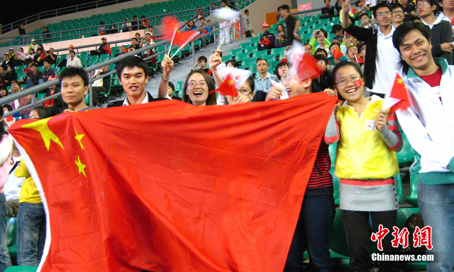 中國女足16日晚迎來小組賽第二個對手越南隊,眾多熱情球迷到場為中國隊加油,女足本次亞運會的目標是進入4強,此前中國女足以10比1大勝第一個對手約旦隊。圖為現(xiàn)場持國旗的球迷。 中新社記者 唐貴江 攝