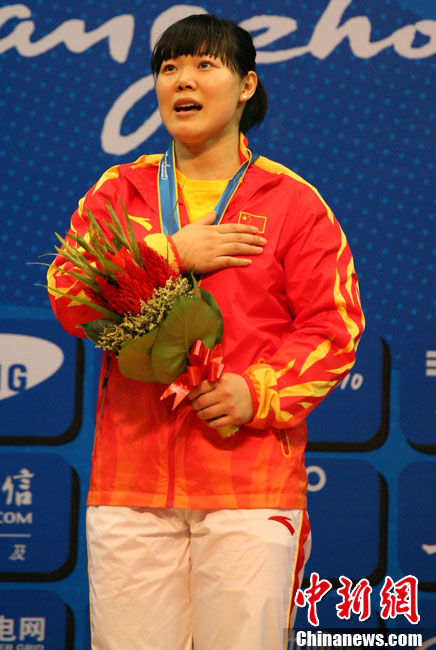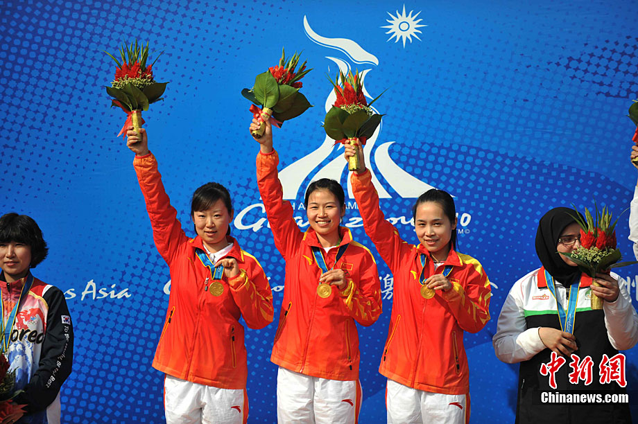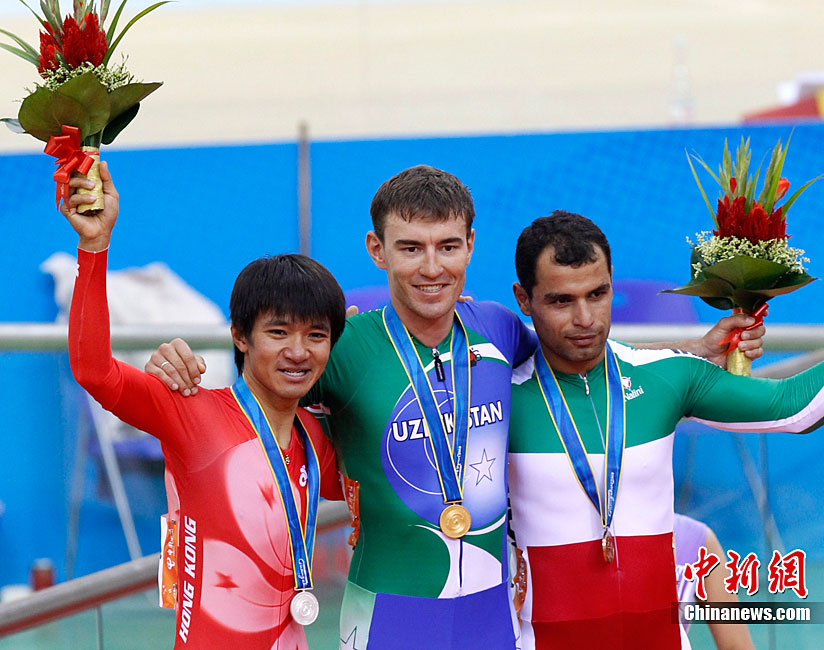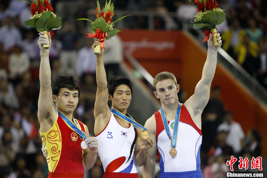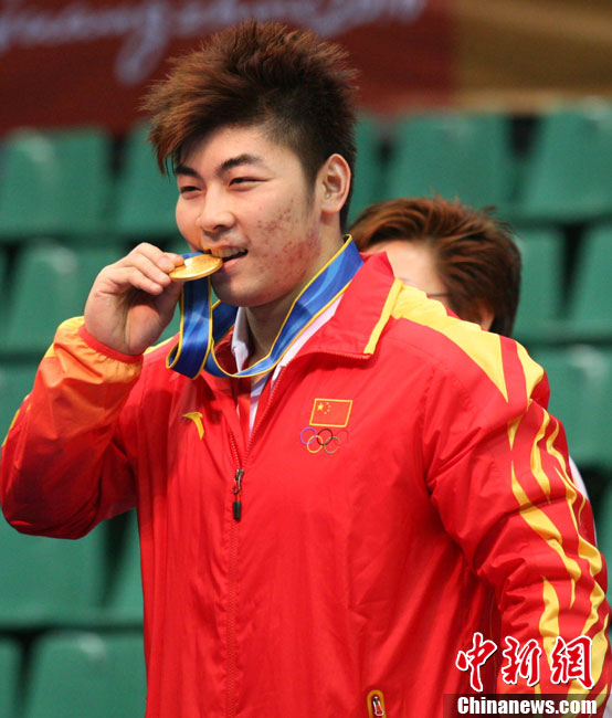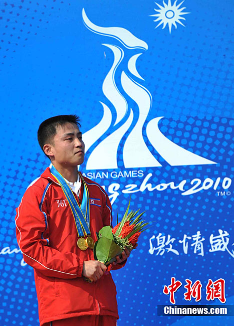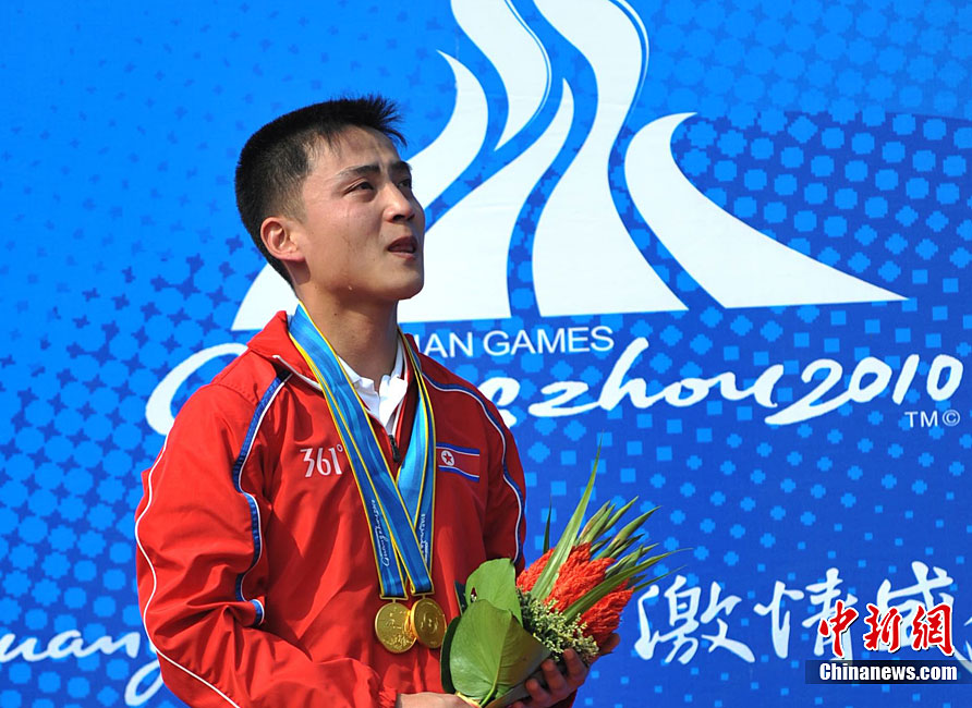 11月17日下午,第16屆廣州亞運(yùn)會(huì)男子10米移動(dòng)靶混合速金牌得主朝鮮運(yùn)動(dòng)員樸明元淚灑領(lǐng)獎(jiǎng)臺。中新社記者 柯小軍 攝