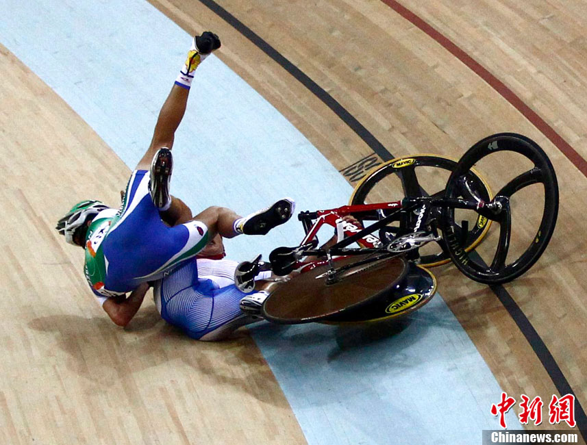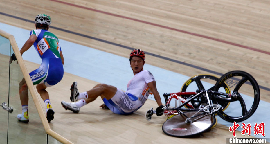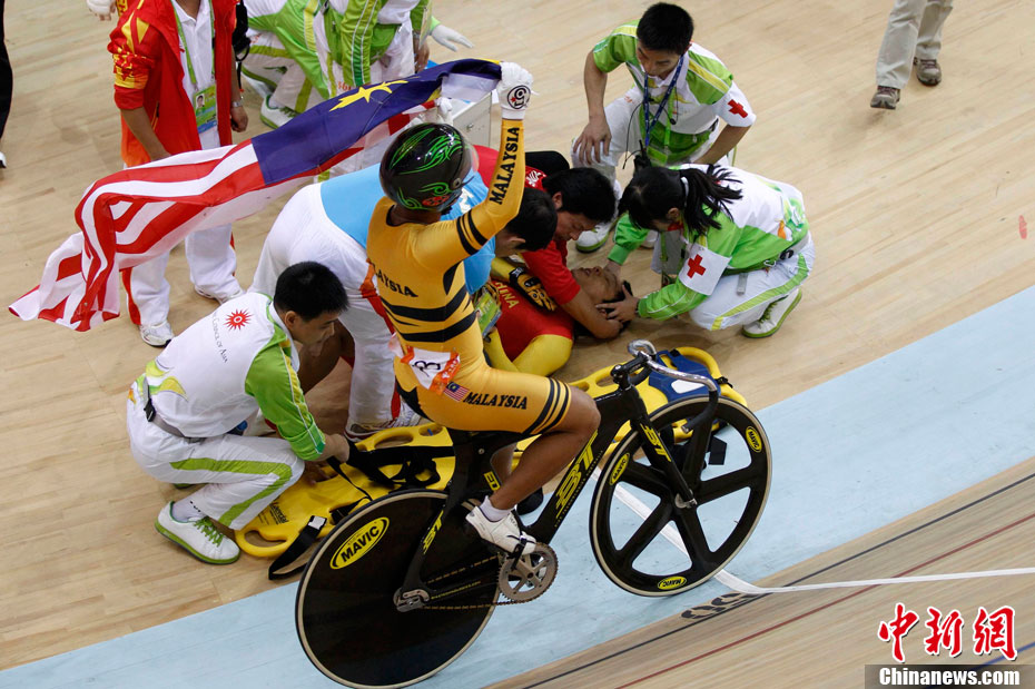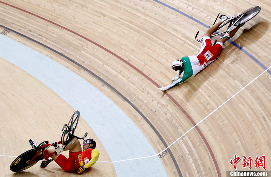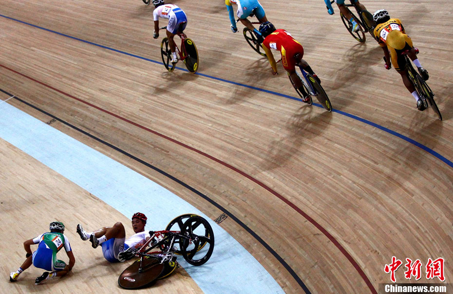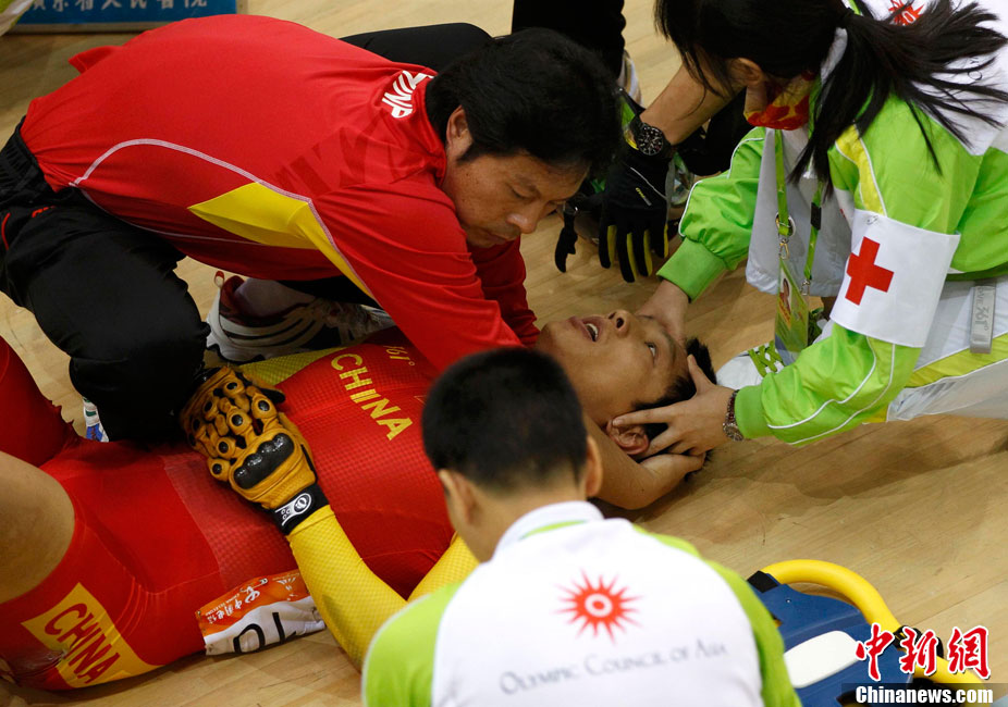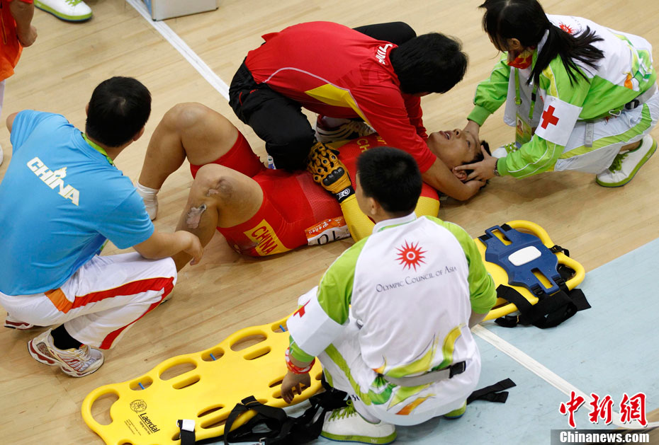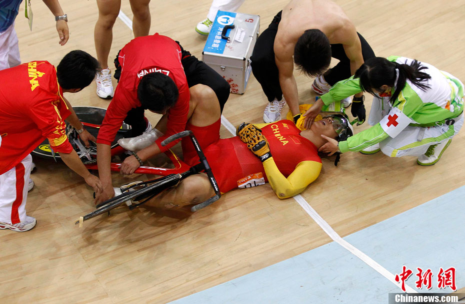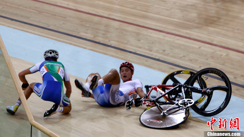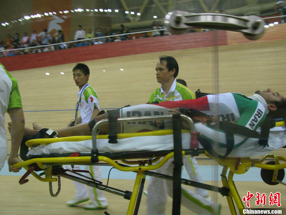 11月17日進(jìn)行的男子場(chǎng)地自行車凱琳賽中再次發(fā)生意外,在比賽最后一圈中,中國(guó)選手張磊和伊朗選手帕拉什-默哈默德發(fā)生碰撞,雙雙退出比賽,后者因?yàn)閭麆?shì)嚴(yán)重已經(jīng)被送往賽會(huì)指定醫(yī)院進(jìn)行治療。
