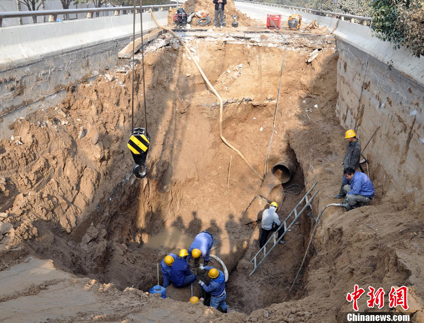 11月18日,河南鄭州爆裂自來水管道正在搶修,鄭州自來水柿園水廠主管道17日發(fā)生爆裂,該水廠是鄭州較大的一所水廠,日供水37萬立方米。目前該事故影響整個(gè)鄭州西南部城市供水,幾十萬居民停水,正在緊急調(diào)用其他水廠向西區(qū)供水,以滿足日常用水需要。中新社發(fā) 豫分 攝