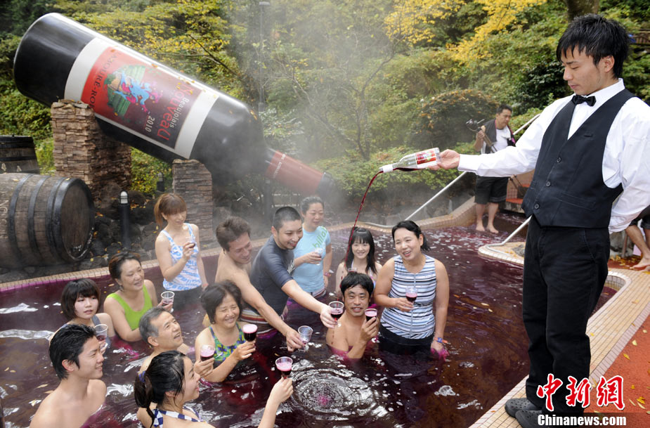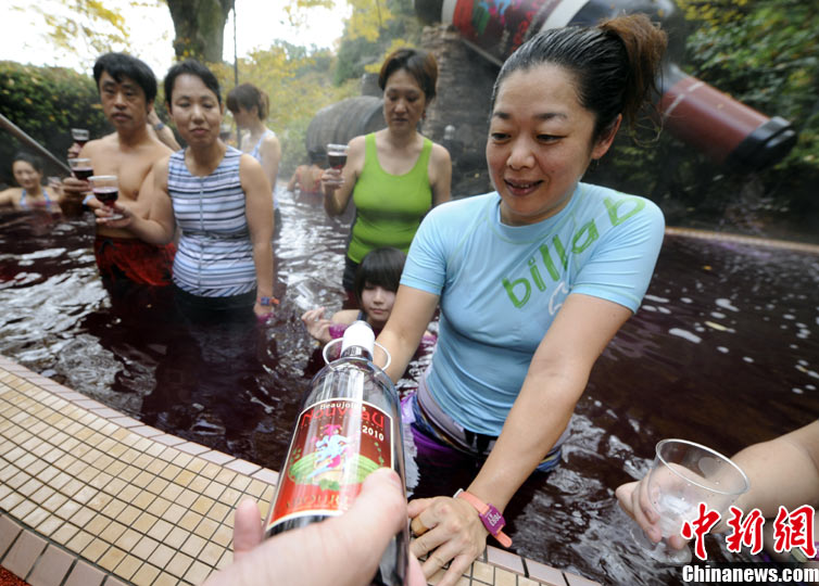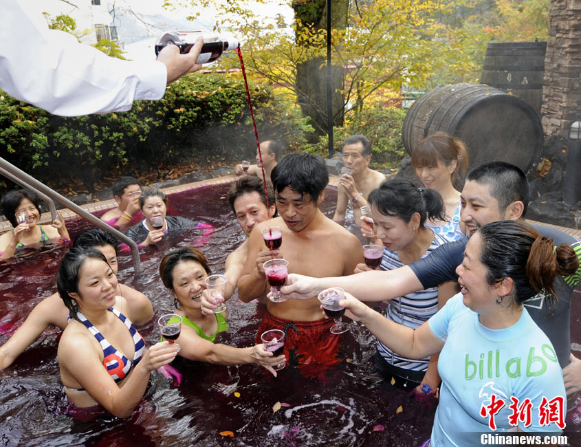 11月18日,一年一度的法國“博若萊”鮮葡萄酒開瓶日到來。由于時差原因,日本飲者得以先嘗為快。在日本箱根的小涌園溫泉浴場,客人們泡在鮮葡萄酒溫泉中舉杯慶祝。