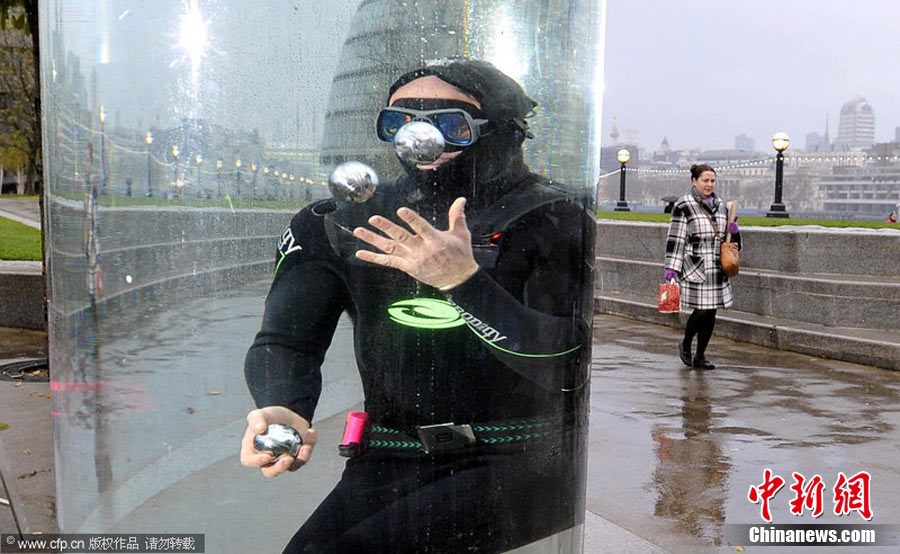 11月18日,一年一度的“吉尼斯世界紀(jì)錄日”。當(dāng)日,世界各地的牛人紛紛亮相“一展身手”。圖為在英國(guó)倫敦,來自北德文郡諾瑟姆的梅林·卡多根以1分20秒的時(shí)間創(chuàng)造了一口氣在水下拋三個(gè)球最長(zhǎng)時(shí)間的世界紀(jì)錄。圖片來源:CFP視覺中國(guó)