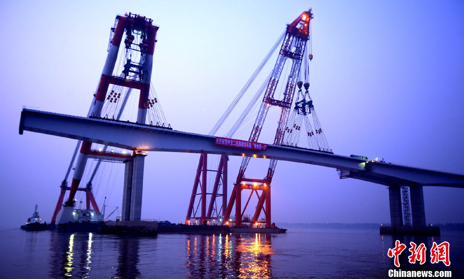 11月19日17時58分,堪稱“神州第一梁”的崇啟大橋首節(jié)185米鋼箱梁吊裝成功。崇啟大橋位于江蘇啟東和上海崇明島之間,長185米、寬16米的主橋變截面鋼箱梁精確吊放標志著崇啟大橋施工難度最大、技術(shù)最復雜、安全風險最高的吊裝工程取得關(guān)鍵性勝利,創(chuàng)造了國內(nèi)橋用鋼箱梁架設(shè)在單節(jié)起吊規(guī)模上的新記錄。 中新社發(fā) 崇啟橋指 供圖