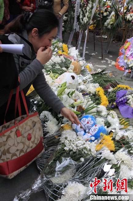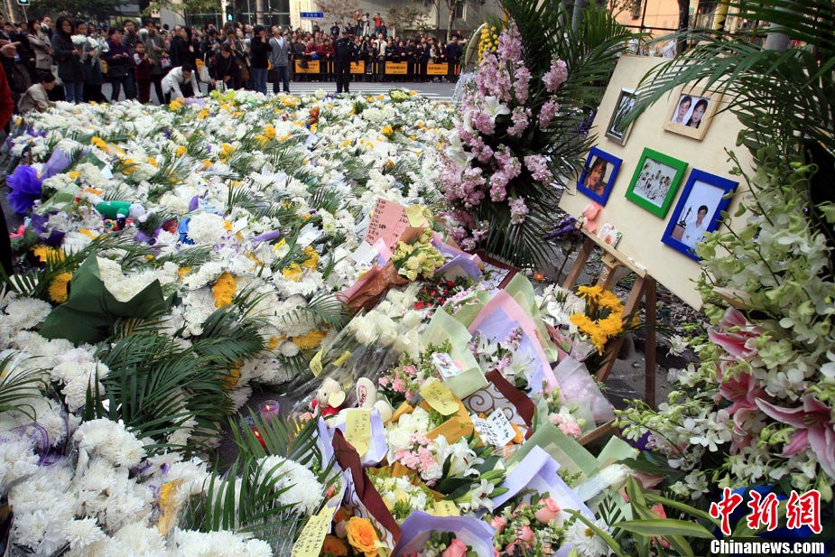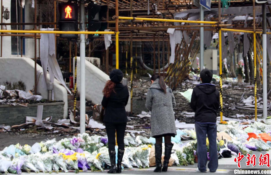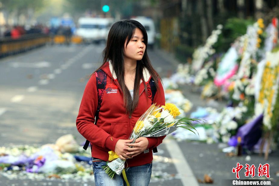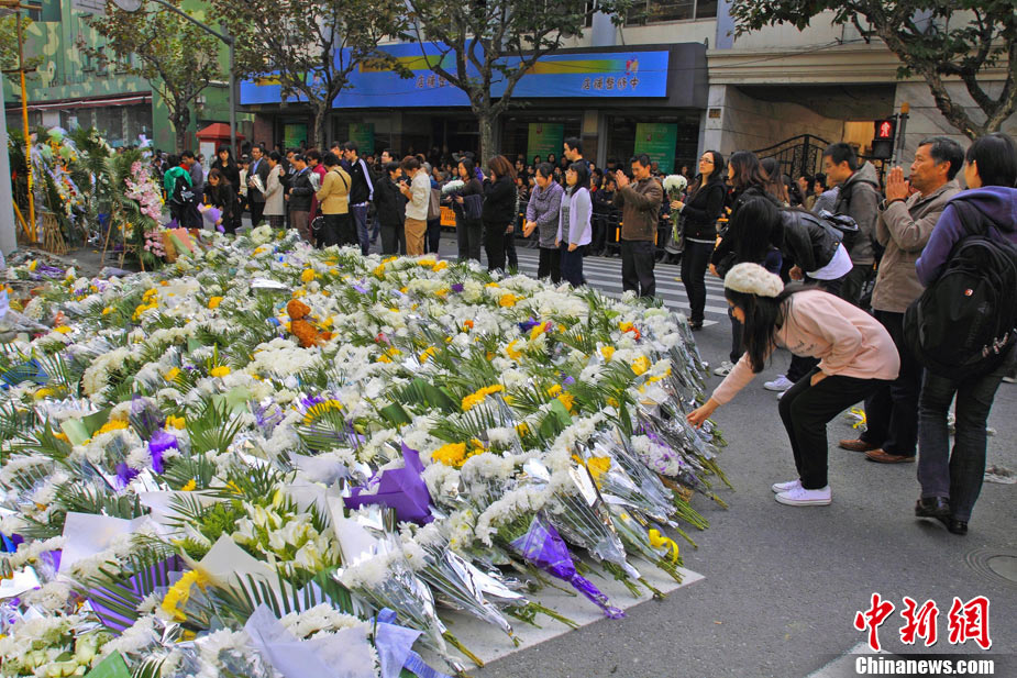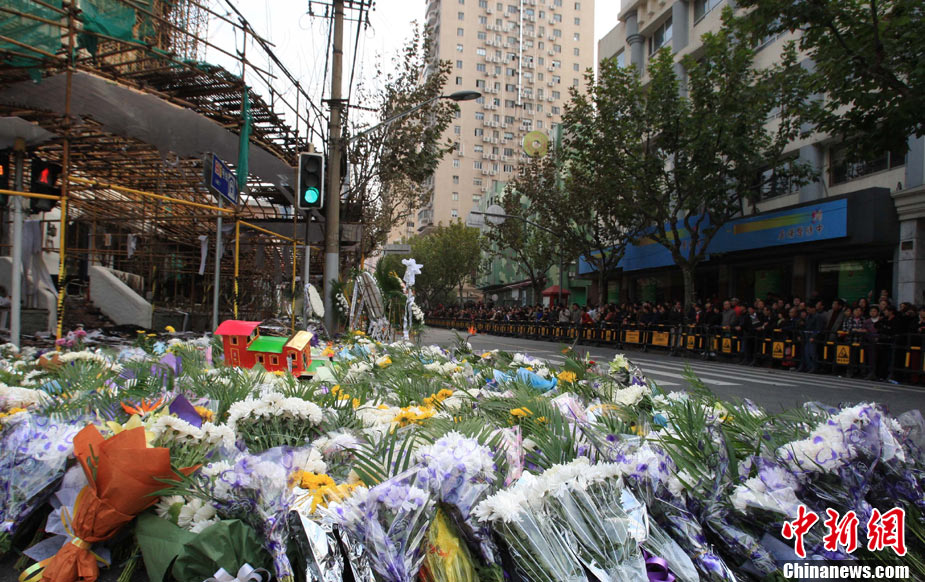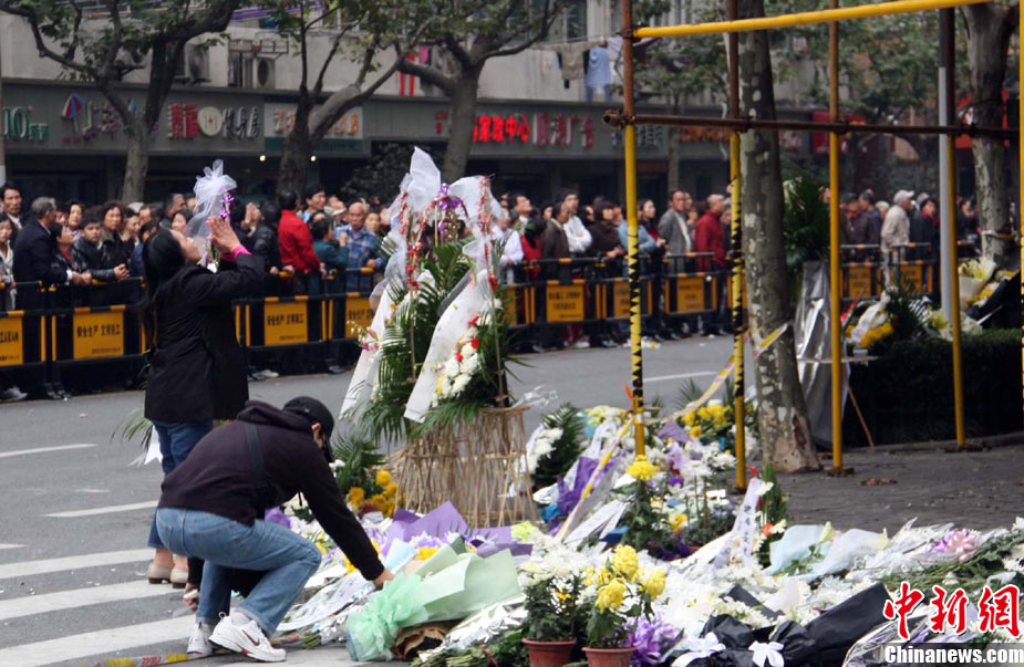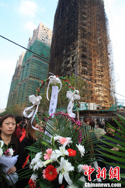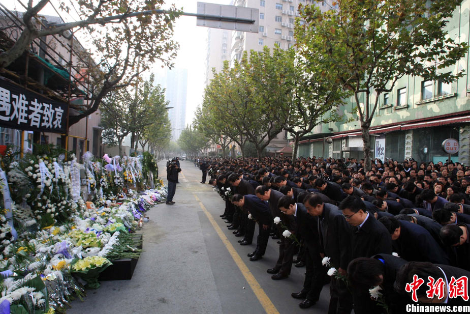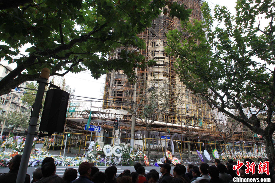 11月21日,上海在靜安區(qū)“11·15”特大火災現(xiàn)場舉行向遇難者致哀活動。中新社記者 潘索菲 攝
