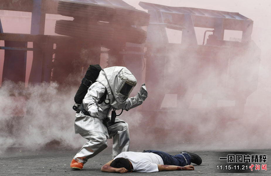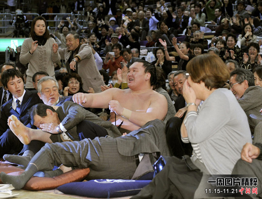 11月15日(周一),日本九州相撲大賽的第二天。圖為來(lái)自蒙古的相撲冠軍白鵬翔Hakuho,(圖中)被推出賽臺(tái)的一瞬間。