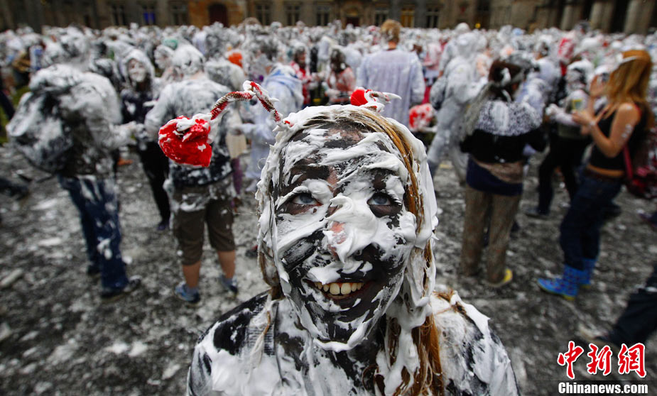2010年11月22日,在蘇格蘭圣安德魯斯大學(xué)舉行的“周一葡萄干”節(jié)中,大學(xué)生們進(jìn)行了一場(chǎng)別開生面的“泡沫大戰(zhàn)”。