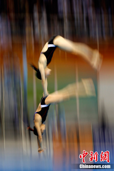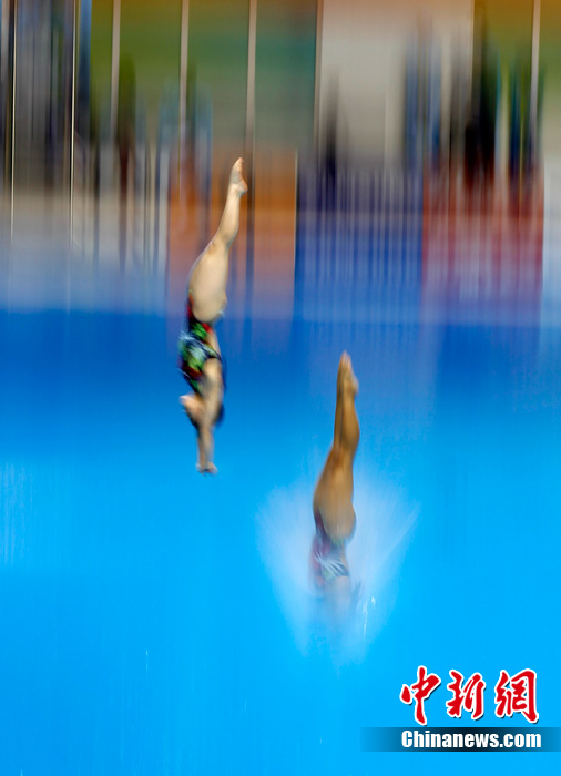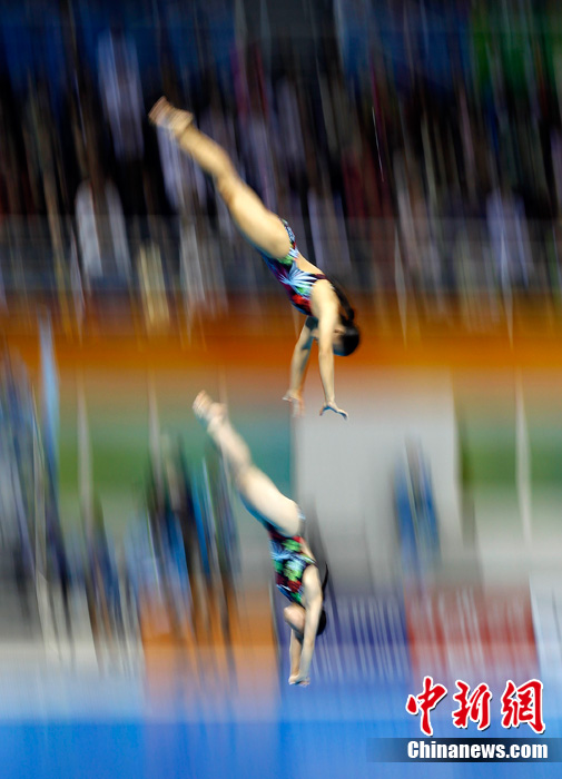 11月23日,廣州亞運(yùn)會(huì)女子雙人10米跳臺(tái)賽場(chǎng)的精彩瞬間。中新社記者 盛佳鵬 攝