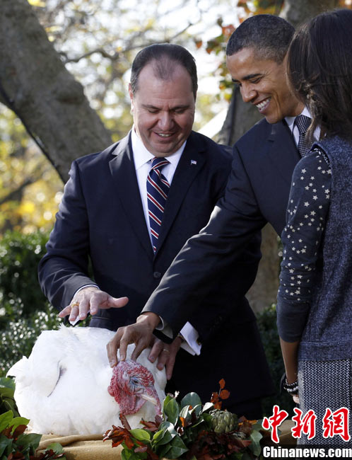 11月24日,兩只分別名叫“蘋果”和“蘋果汁”的加州火雞今天成了全美數(shù)億同類中的幸運兒,在感恩節(jié)前一天,它們得到了“免死金牌”——美國總統(tǒng)奧巴馬依照傳統(tǒng)當(dāng)天親自赦免了它們。