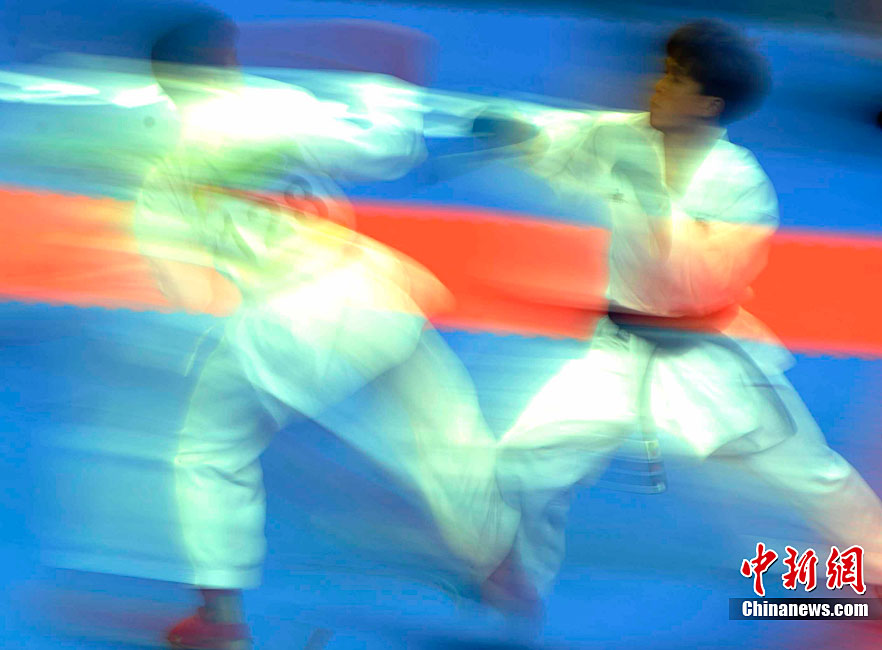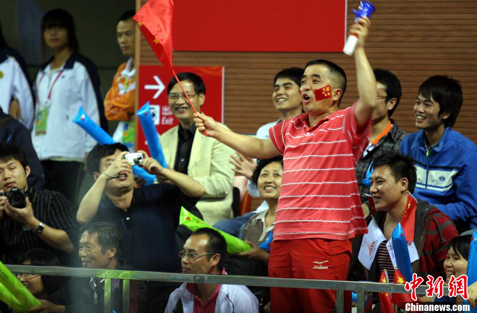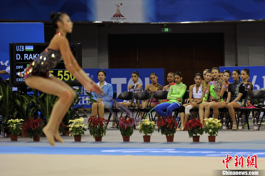 11月25日上午,廣州亞運(yùn)會(huì)藝術(shù)體操個(gè)人、團(tuán)體決賽在亞運(yùn)城體育館開賽。圖為中國(guó)選手在比賽中,場(chǎng)下的各國(guó)運(yùn)動(dòng)員聚精會(huì)神的觀看對(duì)手表現(xiàn)。 中新社記者 金碩 攝