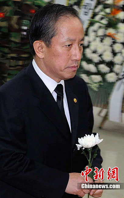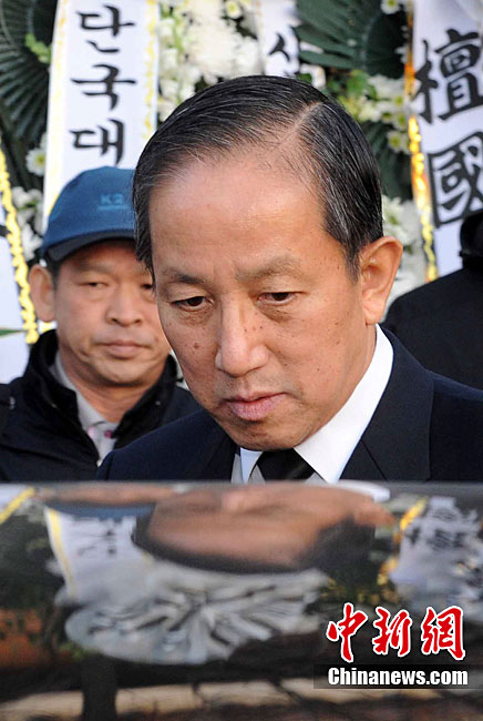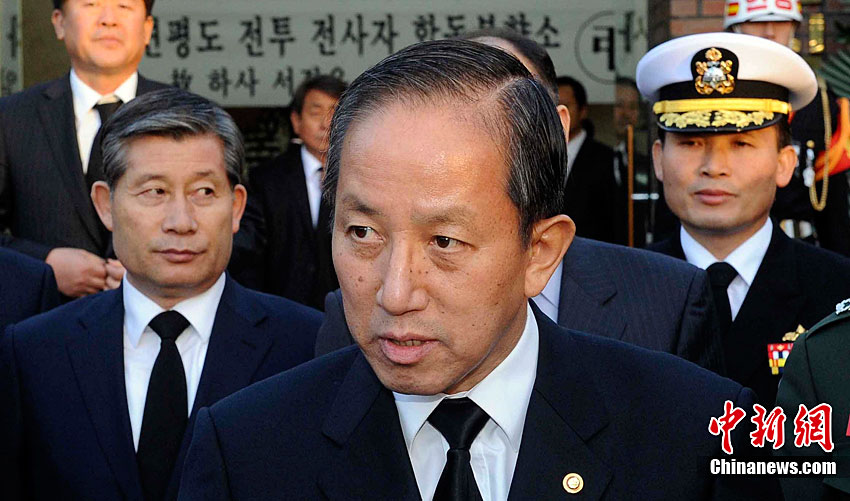 韓國總統(tǒng)秘書室室長任太熙11月25日在青瓦臺召開記者會說,李明博受理了金泰榮的辭呈!疤彀病迸炇录l(fā)生后,金泰榮于5月1日引咎辭職,但為了后續(xù)措施和韓美防長會談等問題,李明博一直未受理辭呈。最近,軍隊內(nèi)陸續(xù)發(fā)生戰(zhàn)機(jī)墜落等事故,并為整頓軍內(nèi)氣氛,李明博今天受理了辭呈。此外,還將替換青瓦臺國防秘書官。圖為25日韓國國防長官金泰榮前往醫(yī)院看望因朝韓“炮戰(zhàn)”受傷人員。