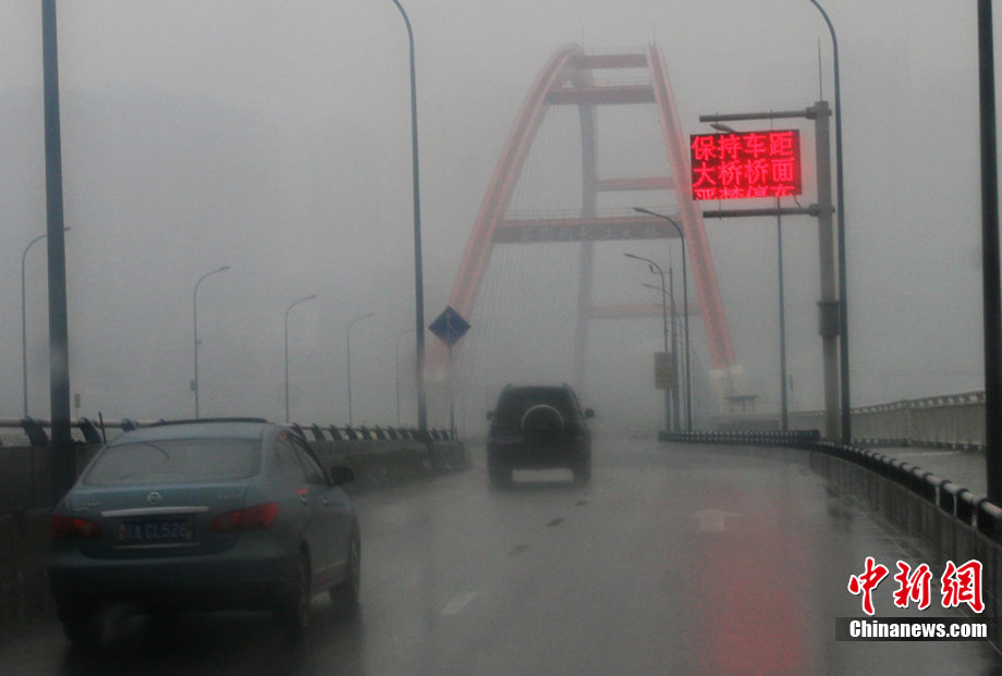 入冬以來(lái),重慶連逢霧天。11月28日,一場(chǎng)雨霧再次來(lái)襲山城重慶。正午時(shí)分,雨霧仍未散去,重慶菜園壩長(zhǎng)江大橋上視線仍不清晰。中新社記者 郭晉嘉 攝