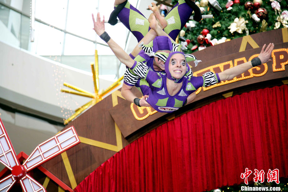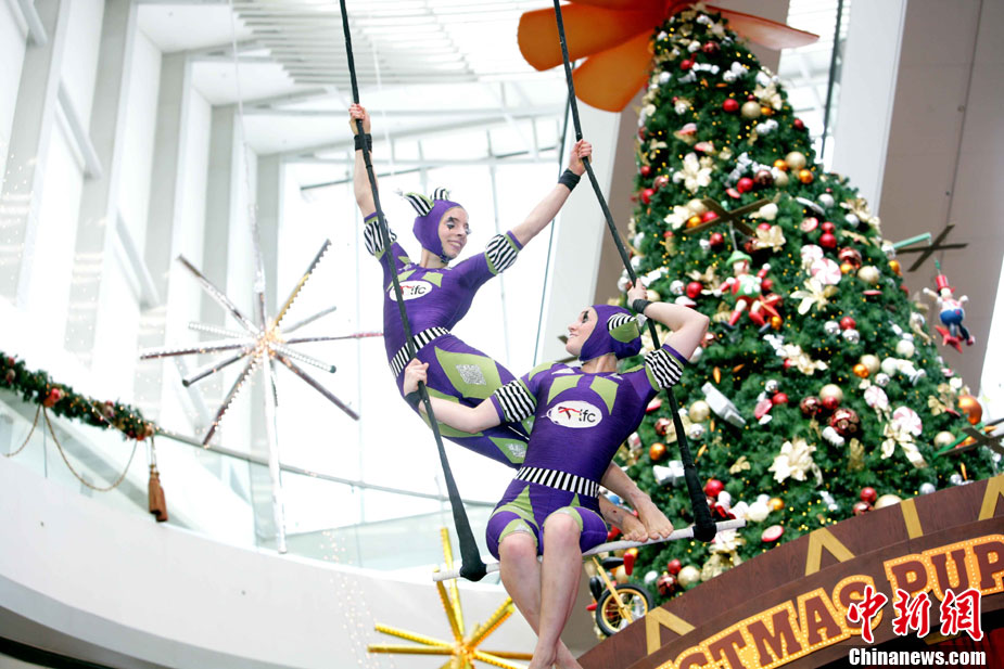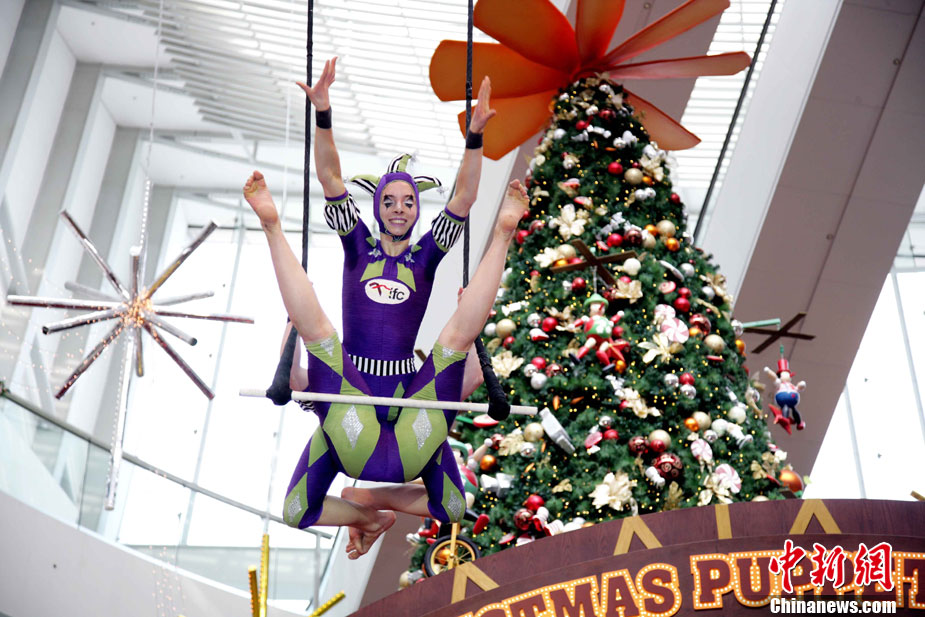 12月14日,香港國(guó)際金融中心上演震撼視覺的高空特技。首次來港獻(xiàn)藝的美國(guó)著名雜技團(tuán)D Squared Trapeze在圣誕樂園內(nèi)打造雙人空中秋千,凌空飛舞表演,帶給觀眾“飛一般”夢(mèng)幻體驗(yàn)。中新社發(fā) 洪少葵 攝