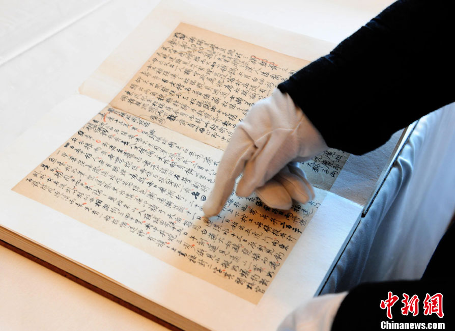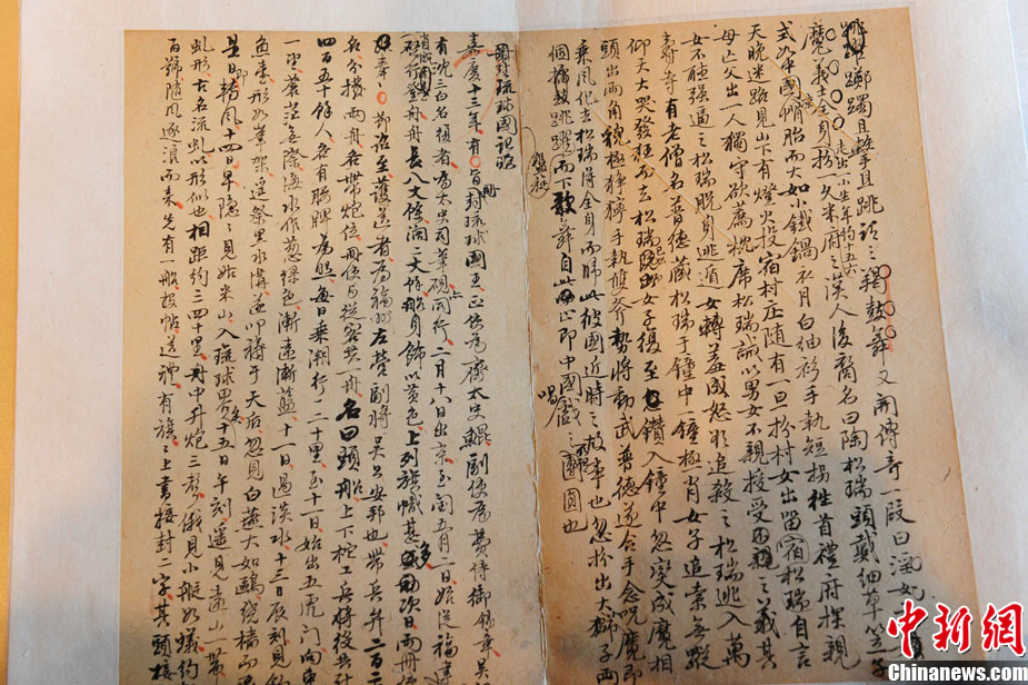12月20日,國(guó)寶級(jí)釣魚島歷史文獻(xiàn)《(<浮生六記>卷五)冊(cè)封琉球國(guó)記略(<海國(guó)記>)》錢梅溪手抄本原件在北京開拍,這是開拍前展示的原件實(shí)物。 中新社記者 侯宇 攝
