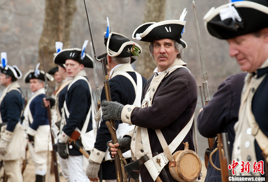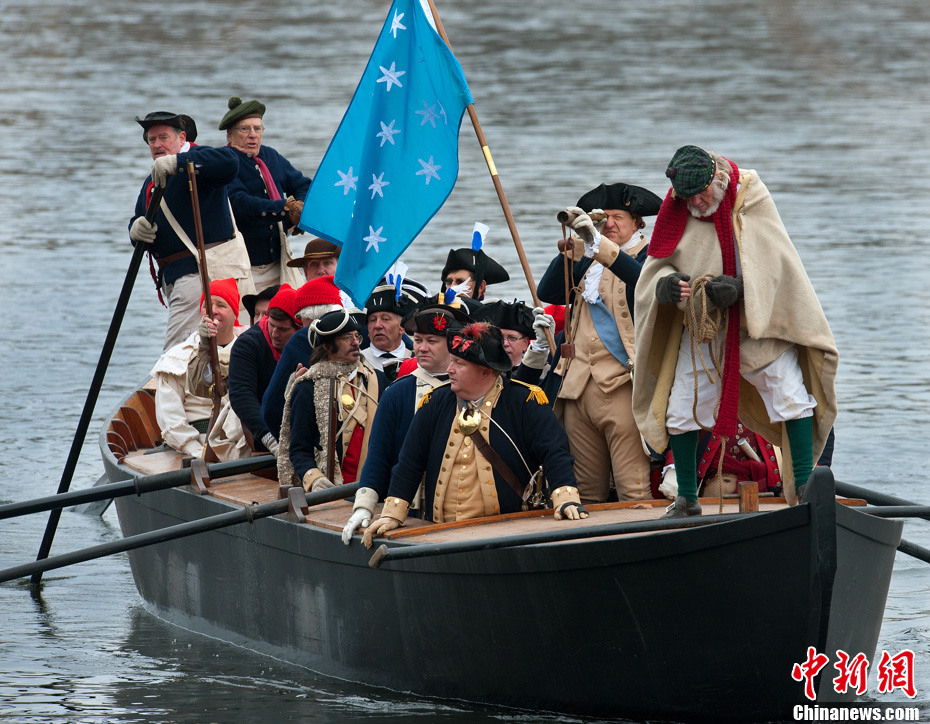 12月25日圣誕節(jié),在美國(guó)賓夕法尼亞州華盛頓橫渡歷史公園,身著美國(guó)獨(dú)立戰(zhàn)爭(zhēng)期間大陸軍軍裝的“士兵們”在“喬治·華盛頓”(右二)的引領(lǐng)下乘船渡過(guò)特拉華河。