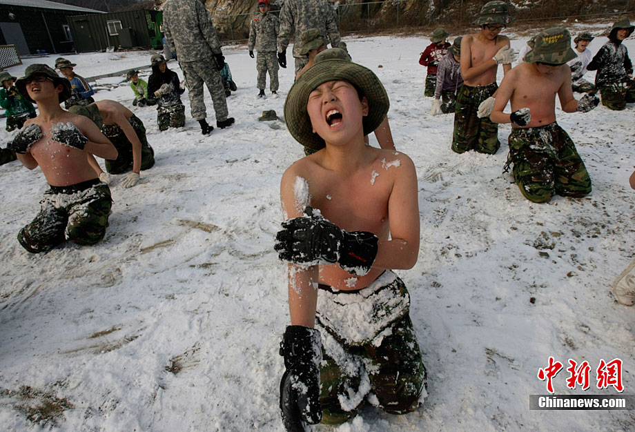 12月27日,韓國安山島Daebu的新兵訓(xùn)練營內(nèi),部分韓國中小學(xué)生赤膊在雪地中進行軍事訓(xùn)練。