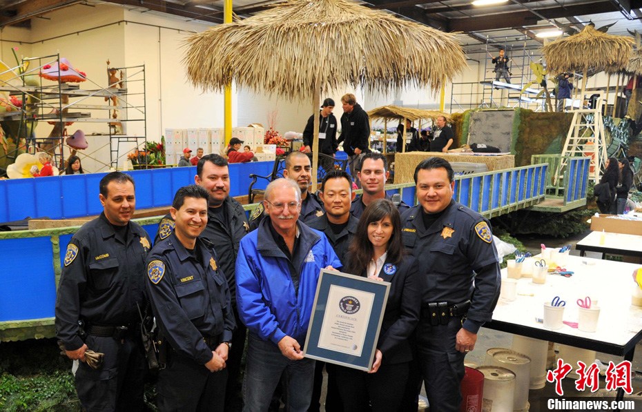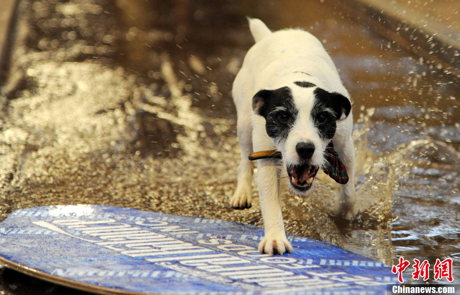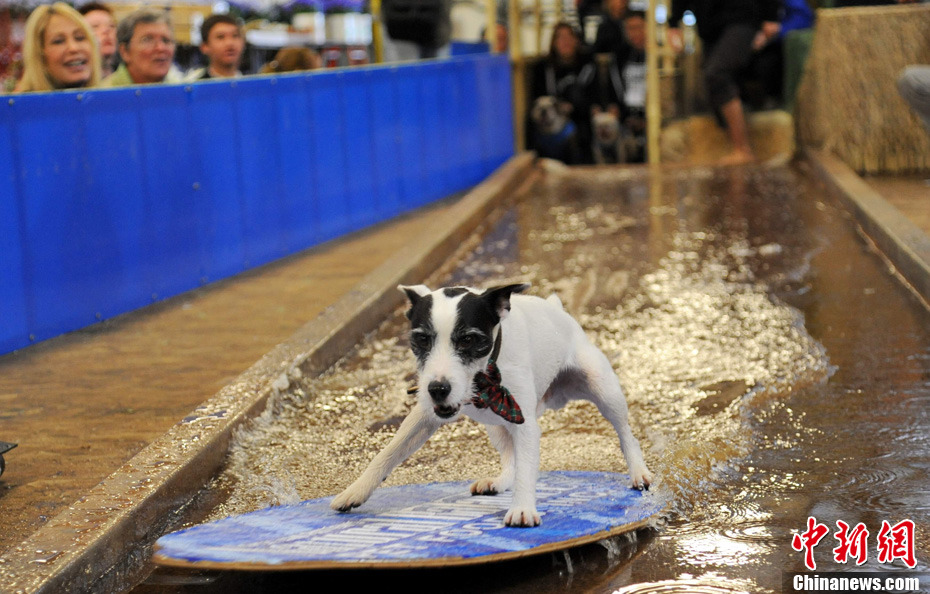 美國(guó)一家寵物食品公司推出的新年花車(chē)12月29日獲得吉尼斯認(rèn)證,成為世界上最重的單體花車(chē);ㄜ(chē)總重達(dá)到35噸,其中包括約15噸水。這輛花車(chē)將參加2011年元旦舉行的第122屆美國(guó)玫瑰花車(chē)大游行,屆時(shí)十只寵物狗將在花車(chē)上表演沖浪、跳水等高難度動(dòng)作。圖為寵物狗沖浪彩排。中新社發(fā) 張煒 攝