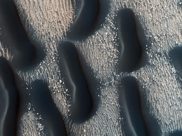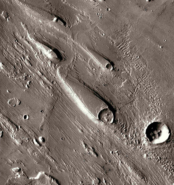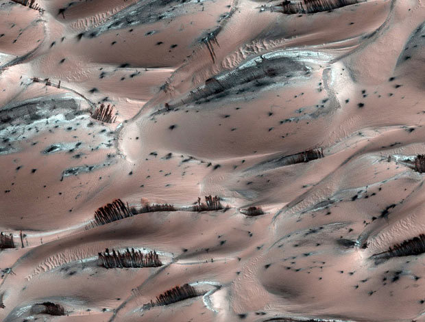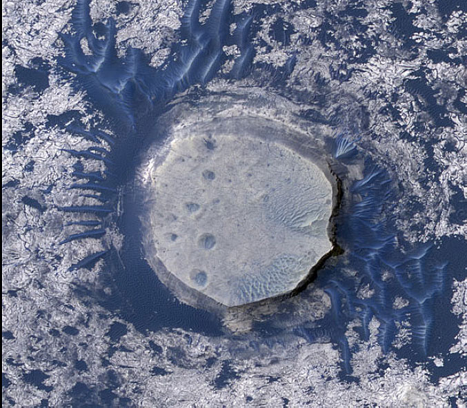 美國(guó)宇航局“火星偵察軌道器”在火星“阿拉比亞陸地平原”地區(qū),拍攝到的奇怪隕石彈坑。自從2006年以來,“火星偵察軌道器”已經(jīng)發(fā)回100兆兆位的信息,相當(dāng)于MP3中存了300萬首歌。