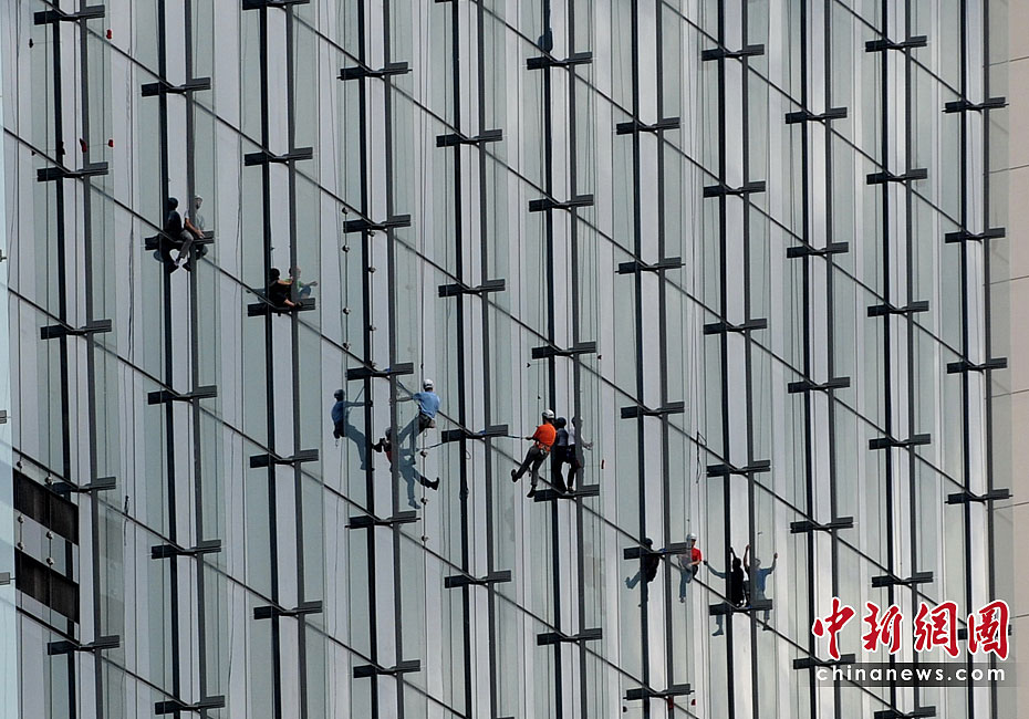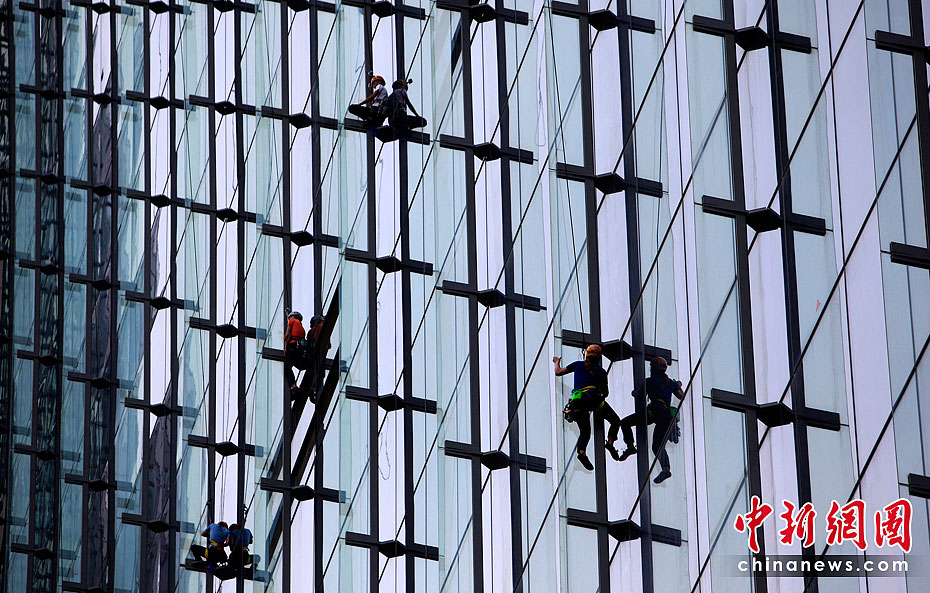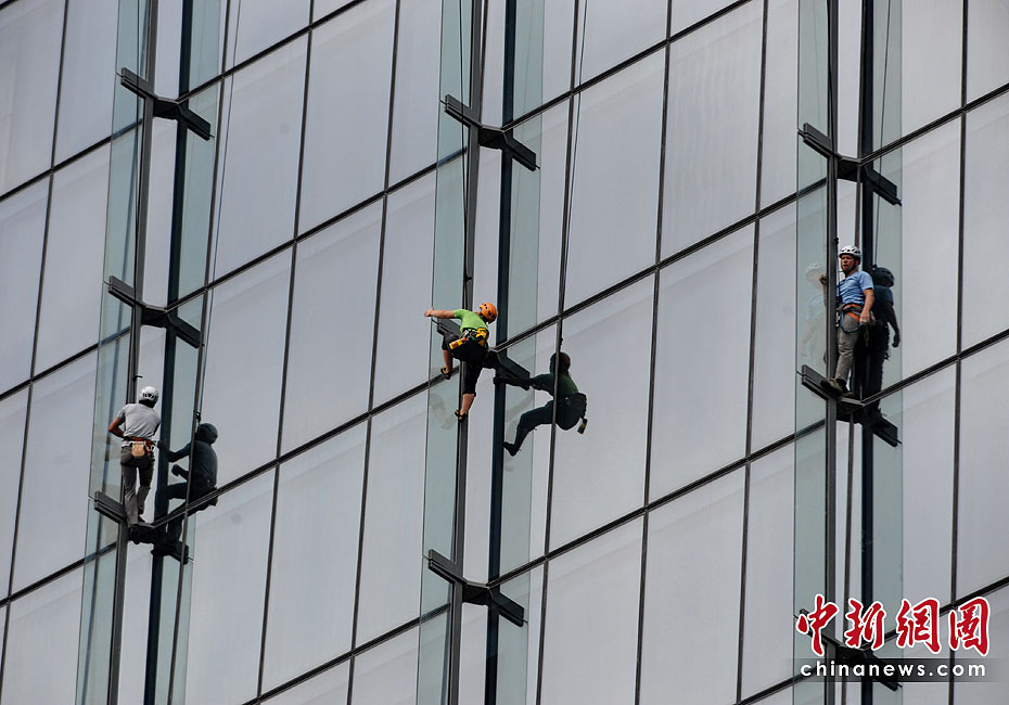 當(dāng)?shù)貢r(shí)間6月23日,21名專業(yè)登山者參加了在新加坡舉行的首屆世界攀登高塔錦標(biāo)賽。21位專業(yè)登山者同時(shí)攀爬3座55層樓高的濱海灣金沙酒店,最先爬到樓頂者為勝。