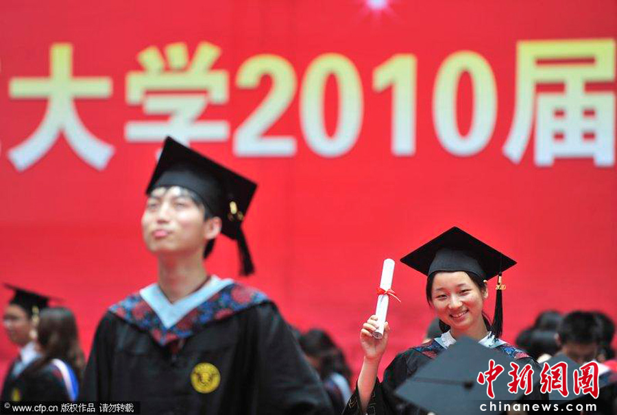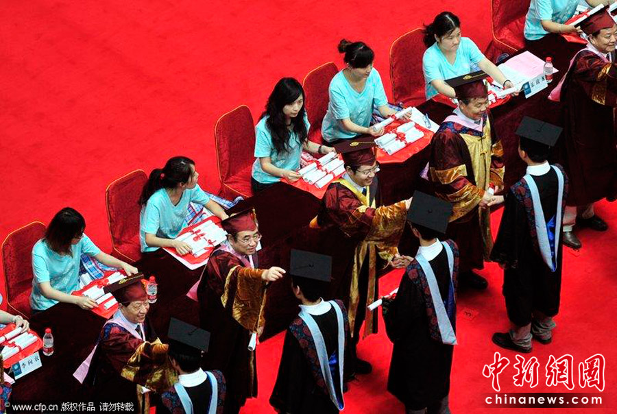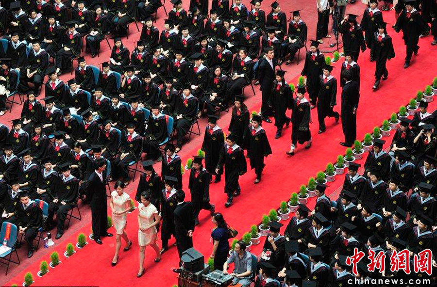 2010年6月24日,華中師范大學(xué)在該校佑銘體育館舉行2010屆畢業(yè)生畢業(yè)典禮暨學(xué)位授予儀式,3177名本科生莊嚴(yán)宣誓。儀式授予現(xiàn)場(chǎng),校方精心為畢業(yè)生準(zhǔn)備了“奧斯卡似的學(xué)位授予典禮”:40多米長(zhǎng)的紅地毯兩側(cè)攝影機(jī)、相機(jī)嚴(yán)陣以待,4名男生筆直站立“警戒”,校禮儀隊(duì)的女生為身穿學(xué)士學(xué)位服的畢業(yè)生們引路。Shepherd C.Zhou/CFP