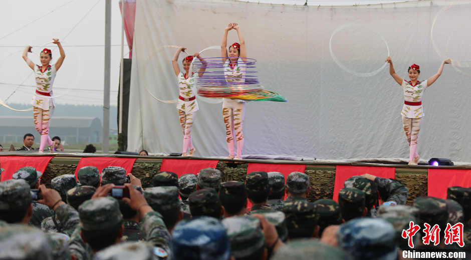 8月10日,隨同中方參演部隊(duì)赴俄羅斯參加“和平使命-2013”中俄聯(lián)演的沈陽(yáng)軍區(qū)政治部文工團(tuán)演員們,為中俄千余名參演官兵獻(xiàn)上了一場(chǎng)精彩的文藝晚會(huì)。豐富多彩的文藝節(jié)目,將位于切巴爾庫(kù)爾訓(xùn)練場(chǎng)的中俄聯(lián)演野營(yíng)村,變成了友誼的盛會(huì)、歡樂(lè)的海洋。圖為魔術(shù)《流光溢彩》。中新社發(fā) 李祥輝 攝